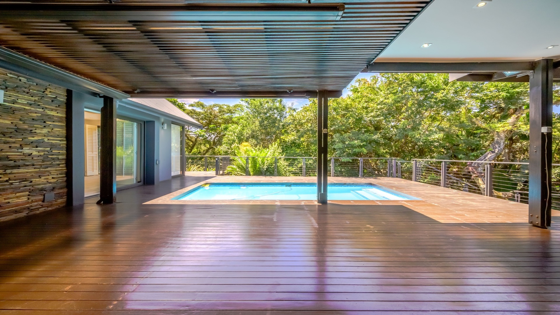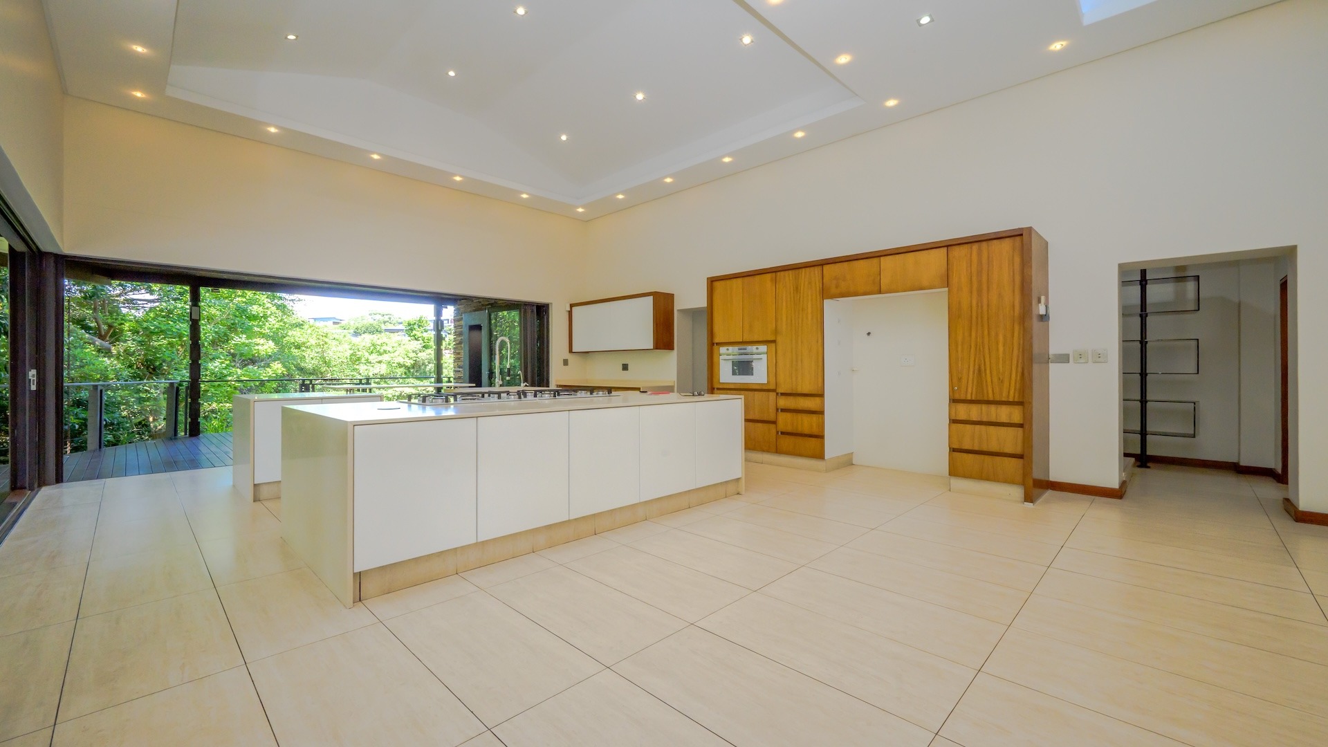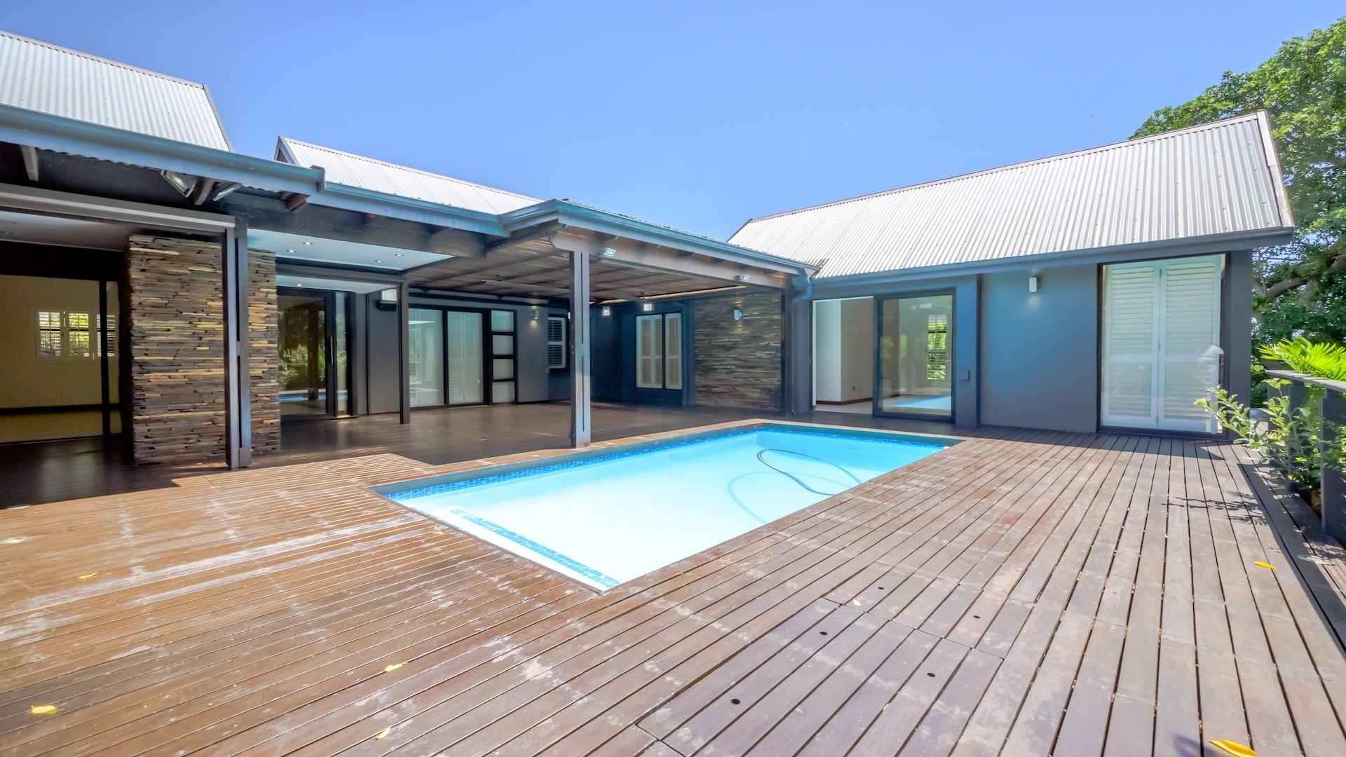 Nestled within the prestigious Simbithi Eco Estate in Ballito, this contemporary residence epitomises sophisticated coastal living. The striking modern architectural design, featuring a sleek grey exterior and corrugated metal roof, immediately captivates, offering exceptional kerb appeal. A generous paved driveway leads to a spacious double garage, providing ample parking for residents and guests alike.