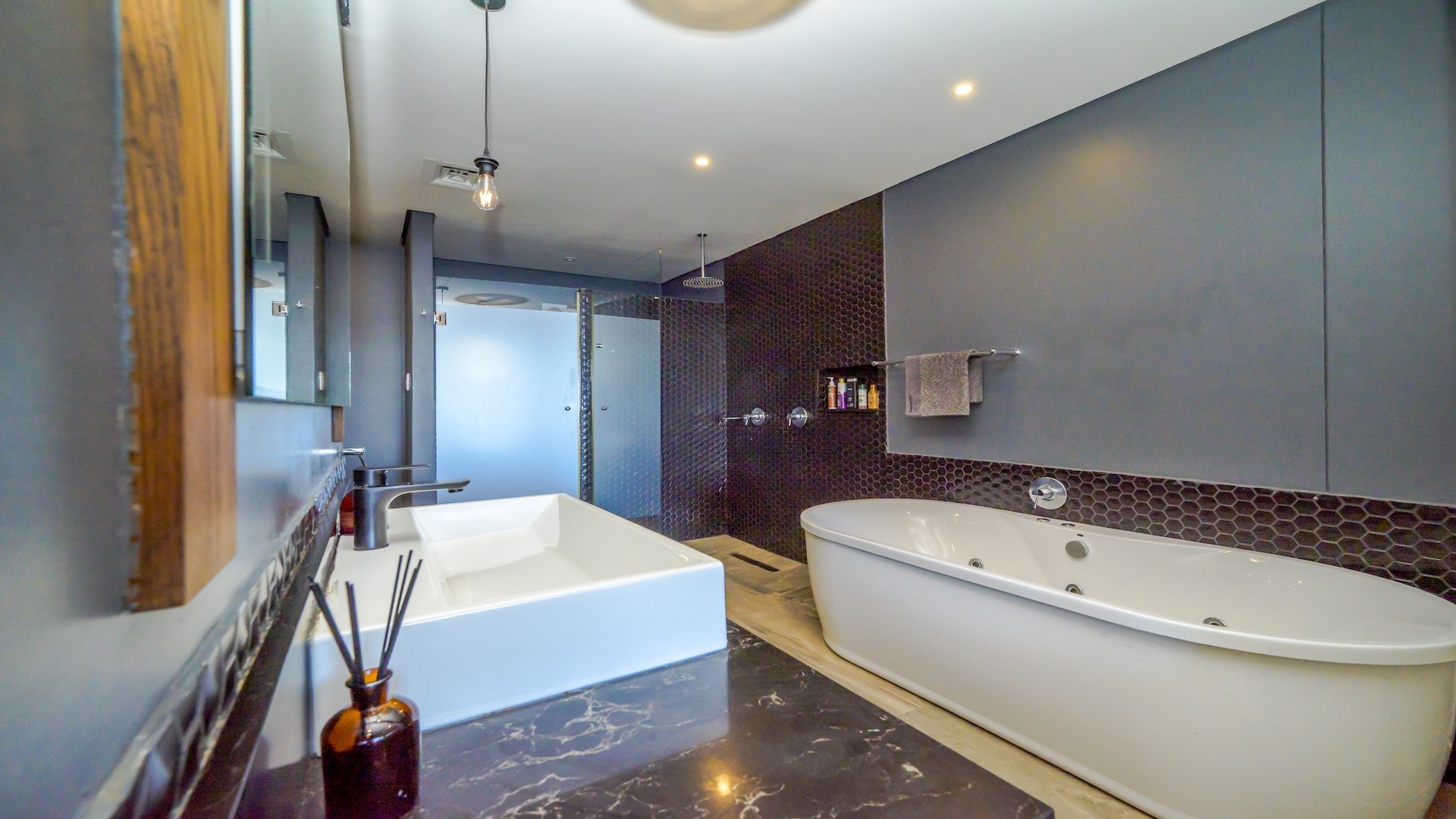 Featuring contemporary fixtures and finishes, including a freestanding bath, double vanity, and walk-in shower, these bathrooms are designed for both comfort and functionality.