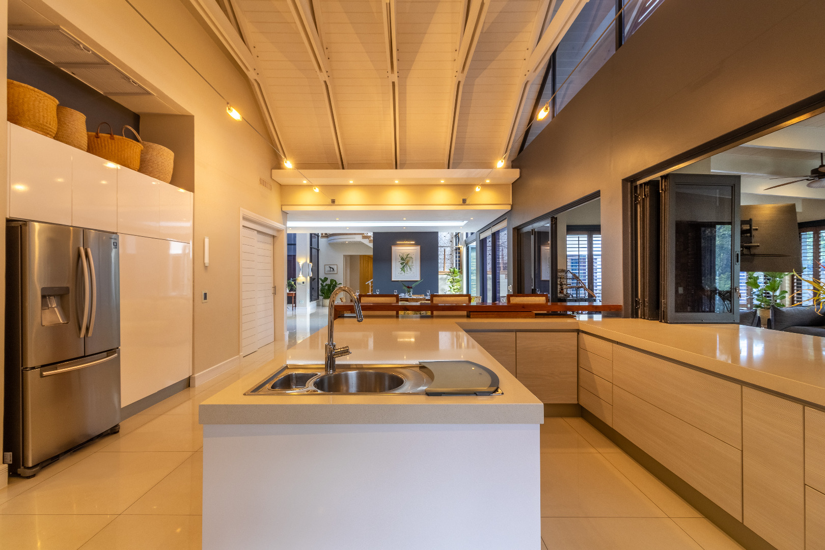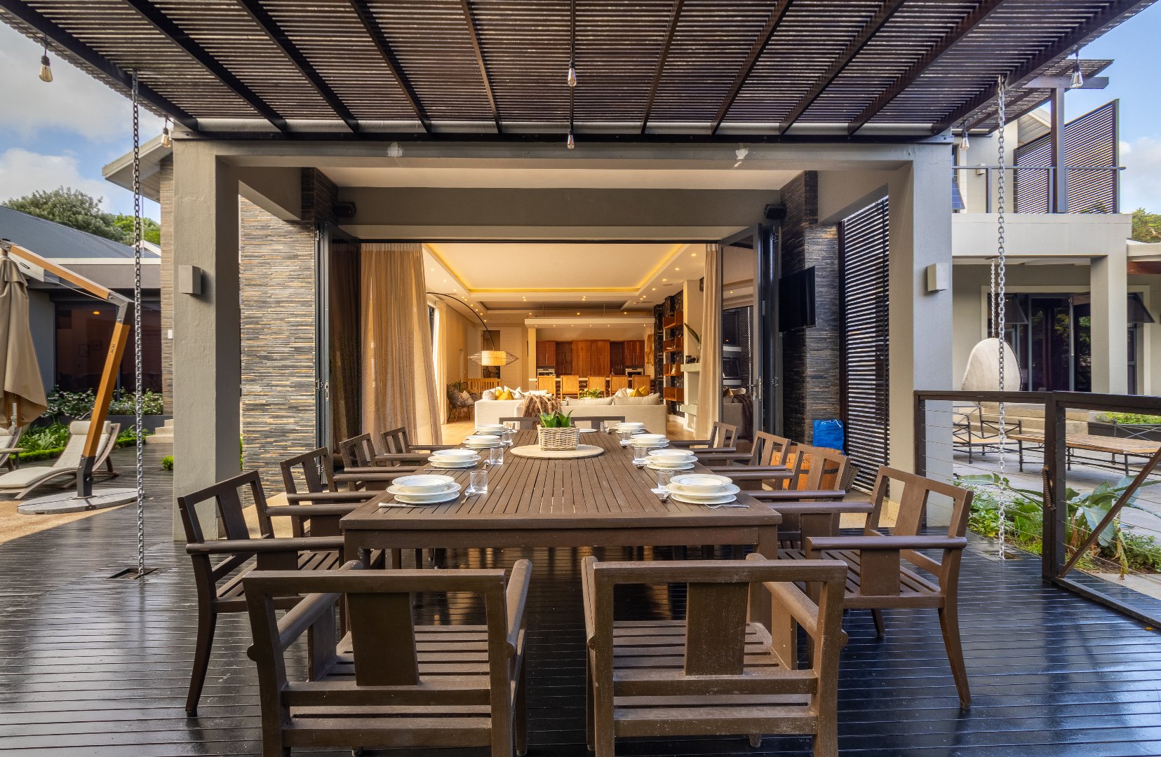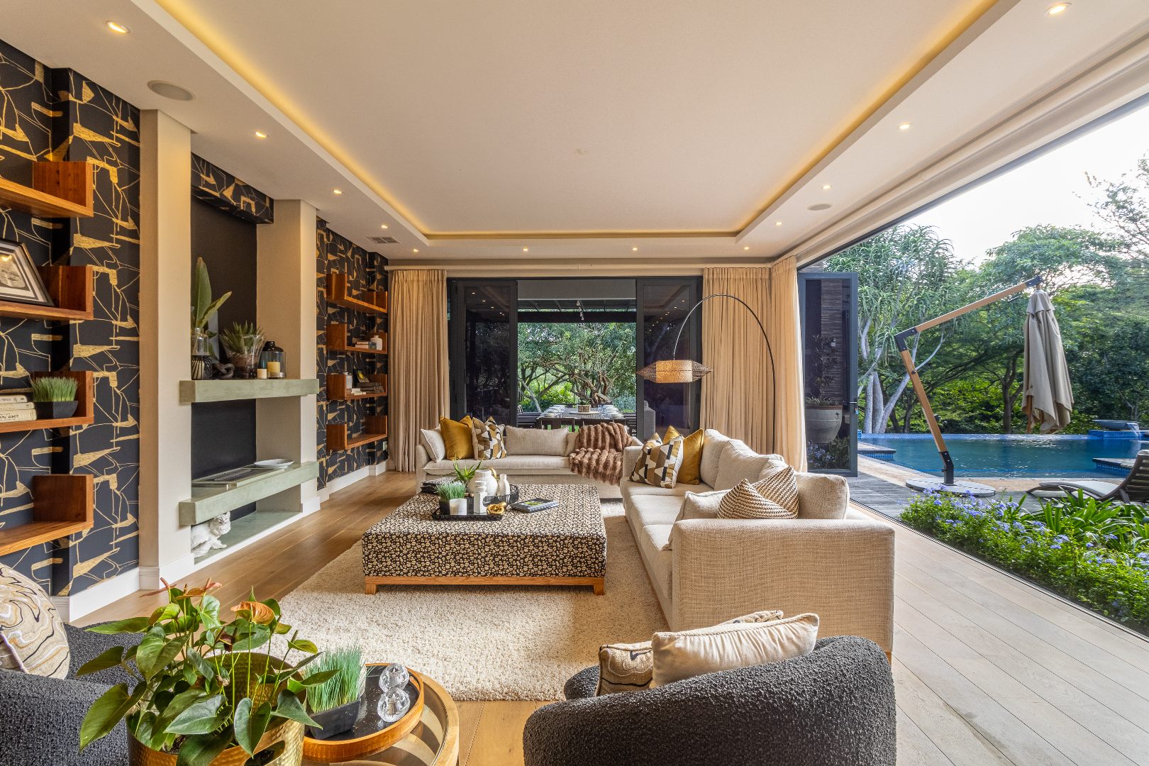 To the right, a chef’s dream kitchen awaits — fully open-plan with an expansive serving counter, servicing the enclosed outdoor patio and breakfast nook. The patio is fitted with a built-in outdoor fireplace that exudes warmth and ambiance during chilly winter evenings, while stacking doors open wide to reveal a manicured garden and a large, heated pool — the ultimate spot to relax with a cold drink in hand. A dedicated braai area and built-in pizza oven make this the perfect setting for casual gatherings or sophisticated alfresco dining.