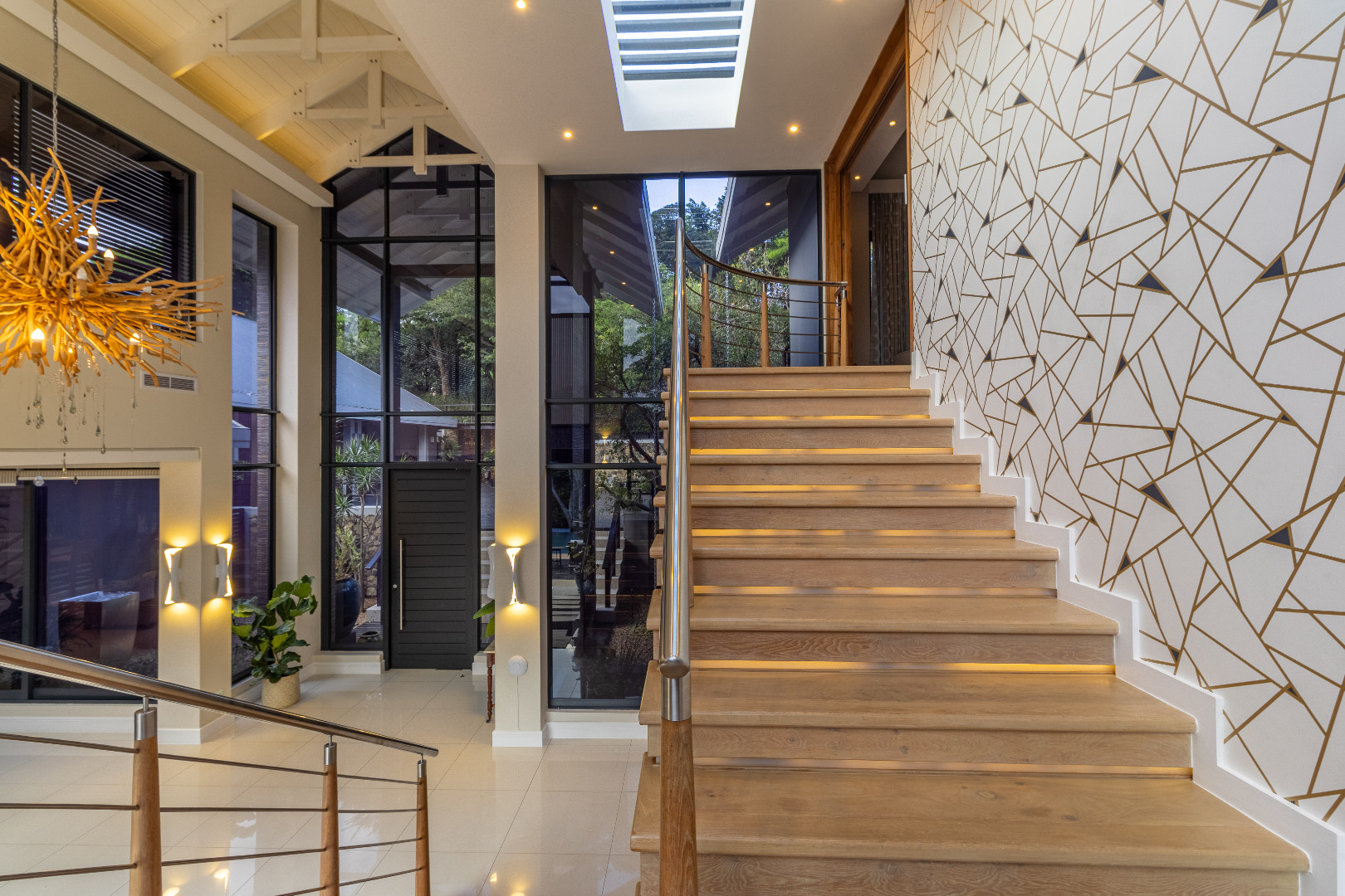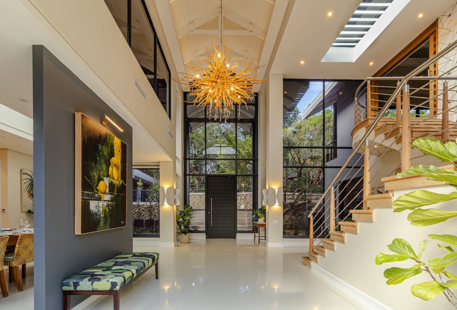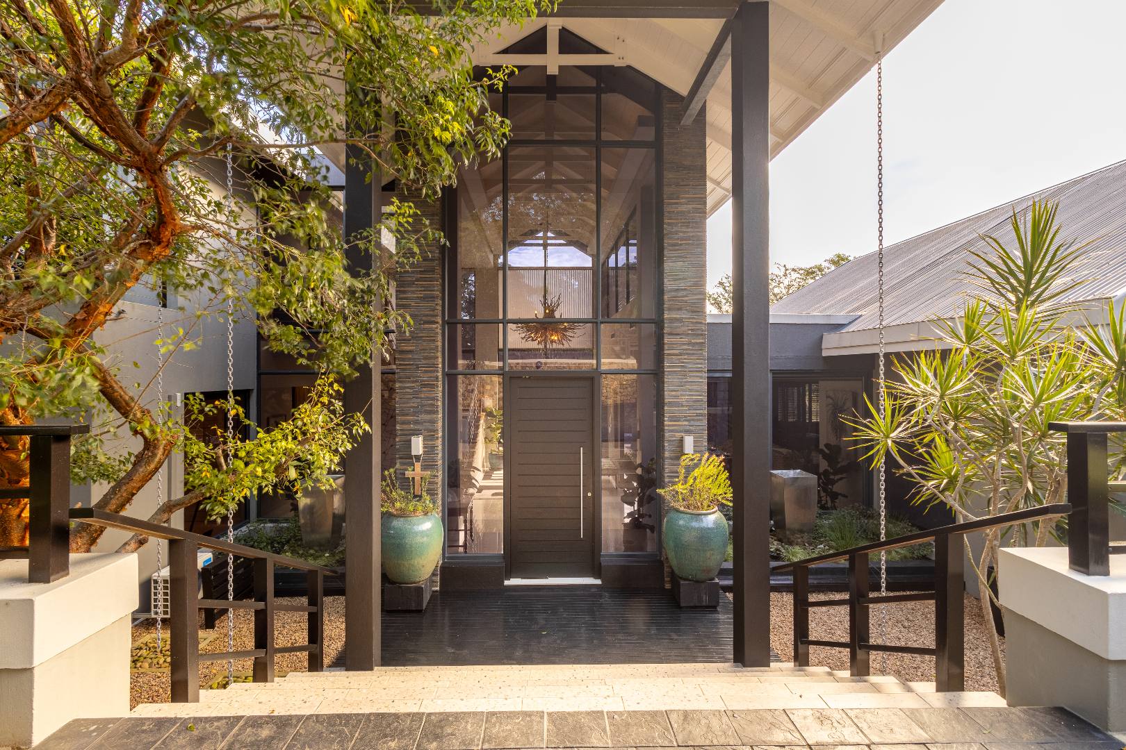 As you approach the home, you're welcomed by a dramatic double-volume glass entrance, setting the tone for what lies beyond. The architecture blends earthy textures with sleek modern finishes, creating a seamless connection between luxury living and nature.