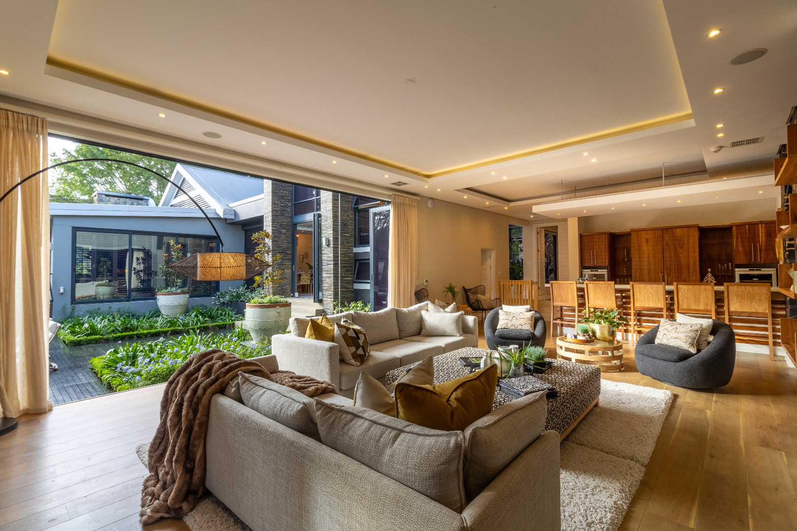 To the left, the formal entertainment space includes a formal lounge, an opulent TV/Cinema room, and a stunning upmarket bar — all flowing effortlessly onto the outdoor spaces, giving you multiple zones to unwind, entertain, or simply take in the serenity.