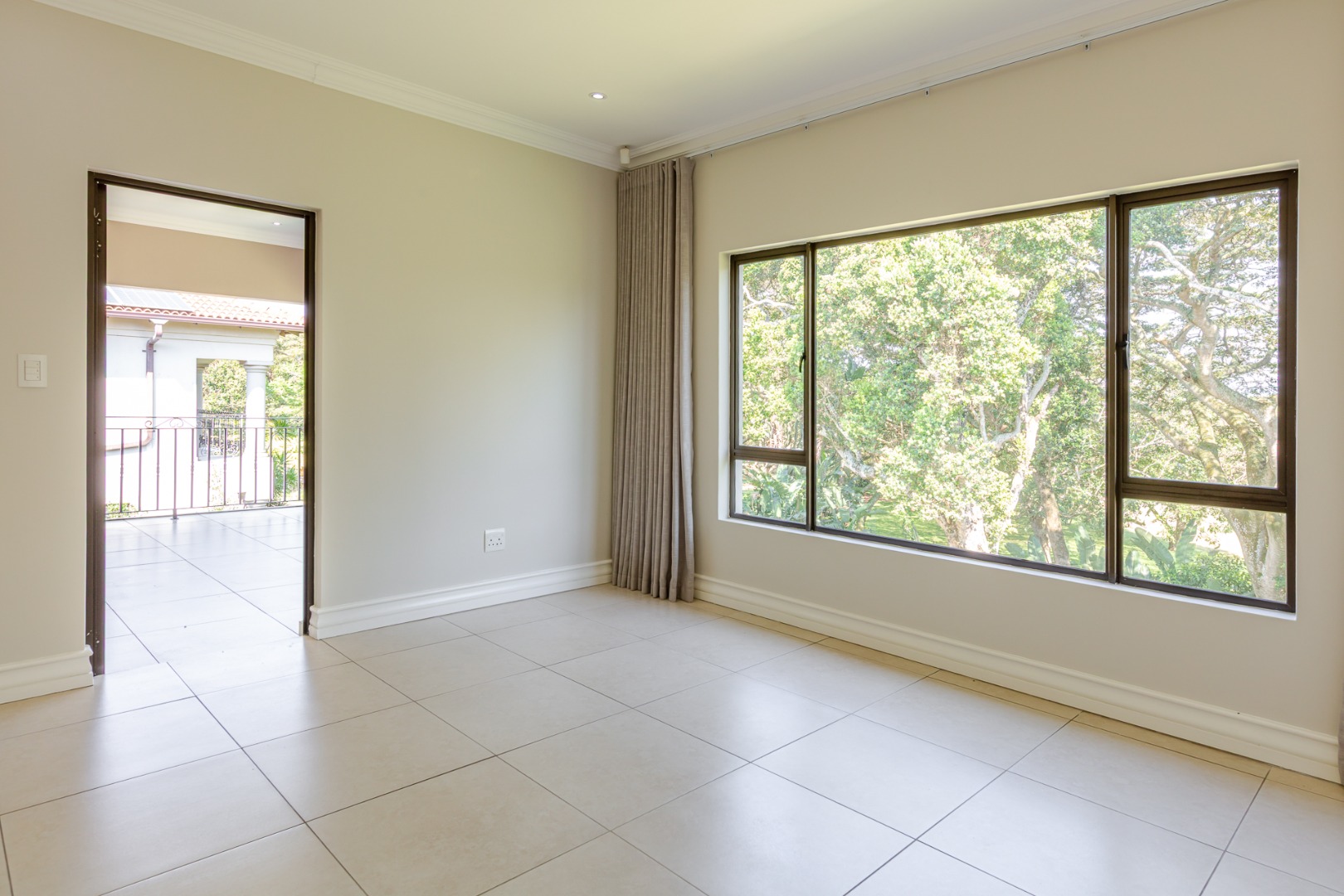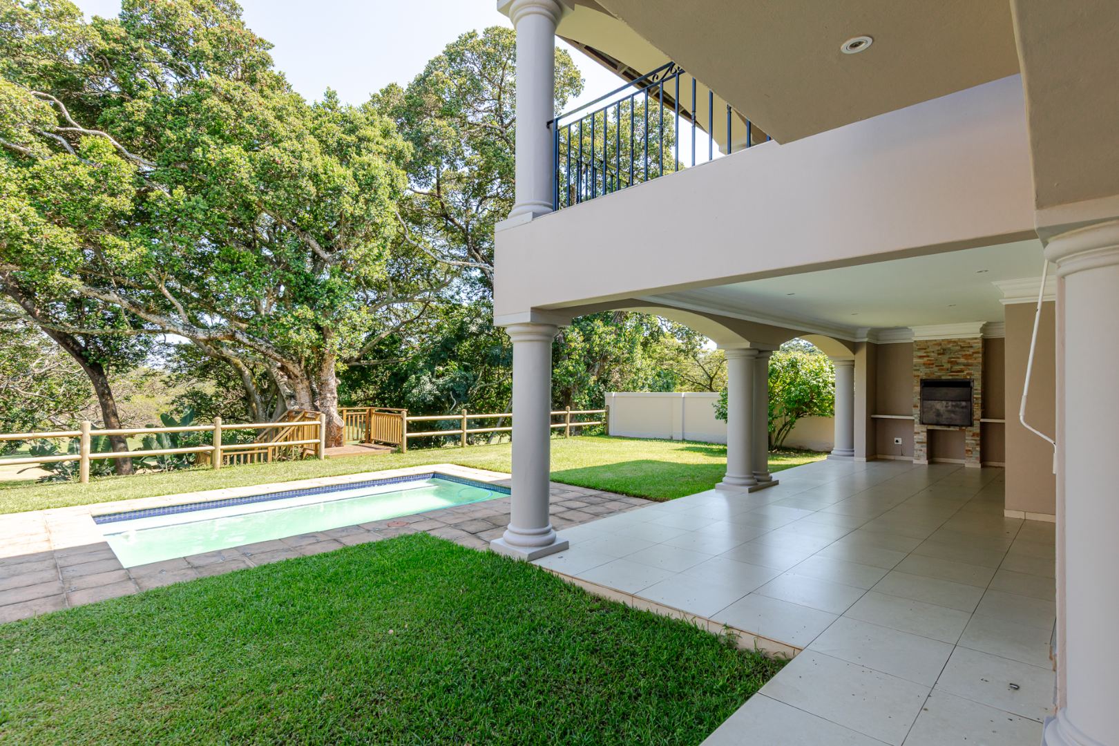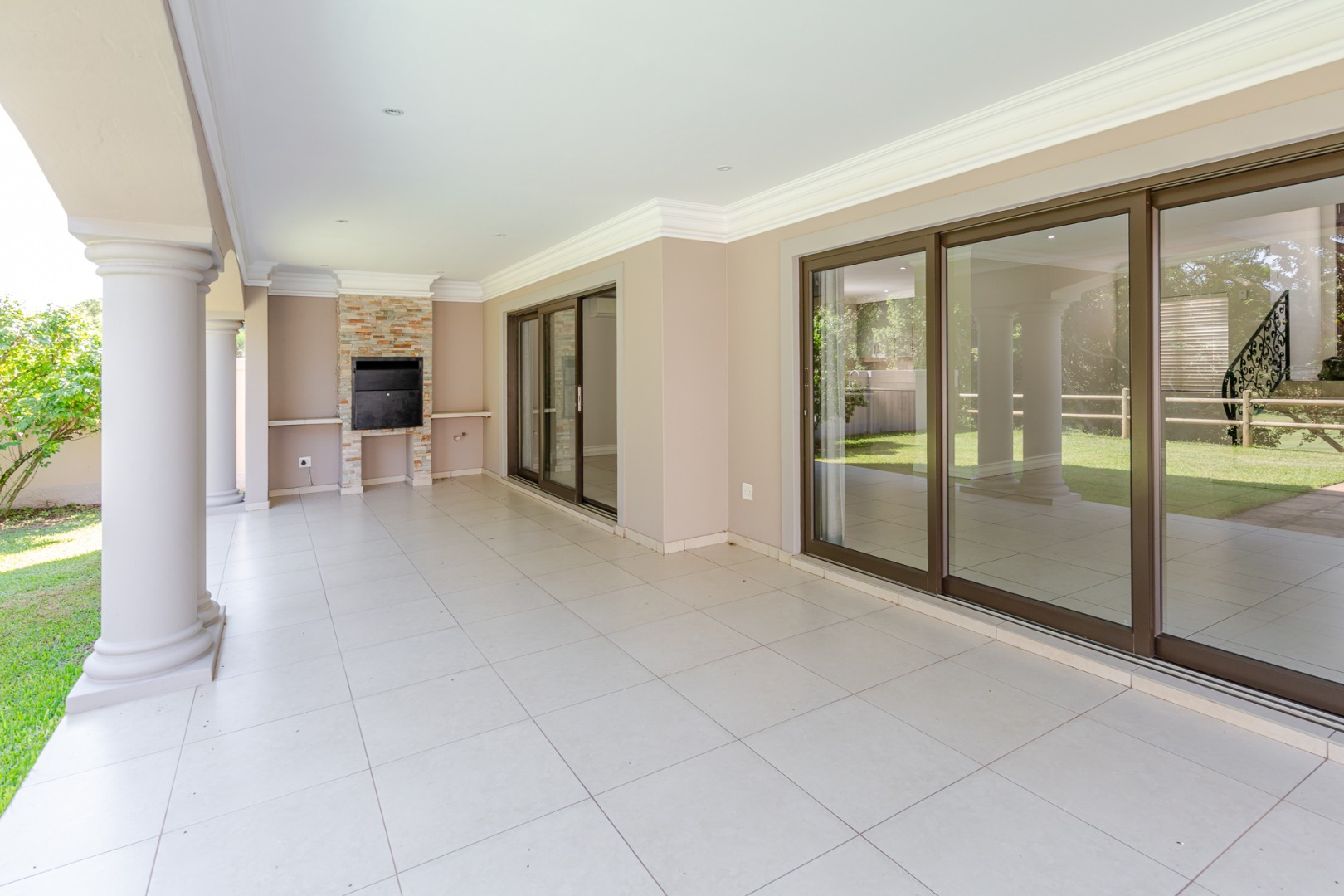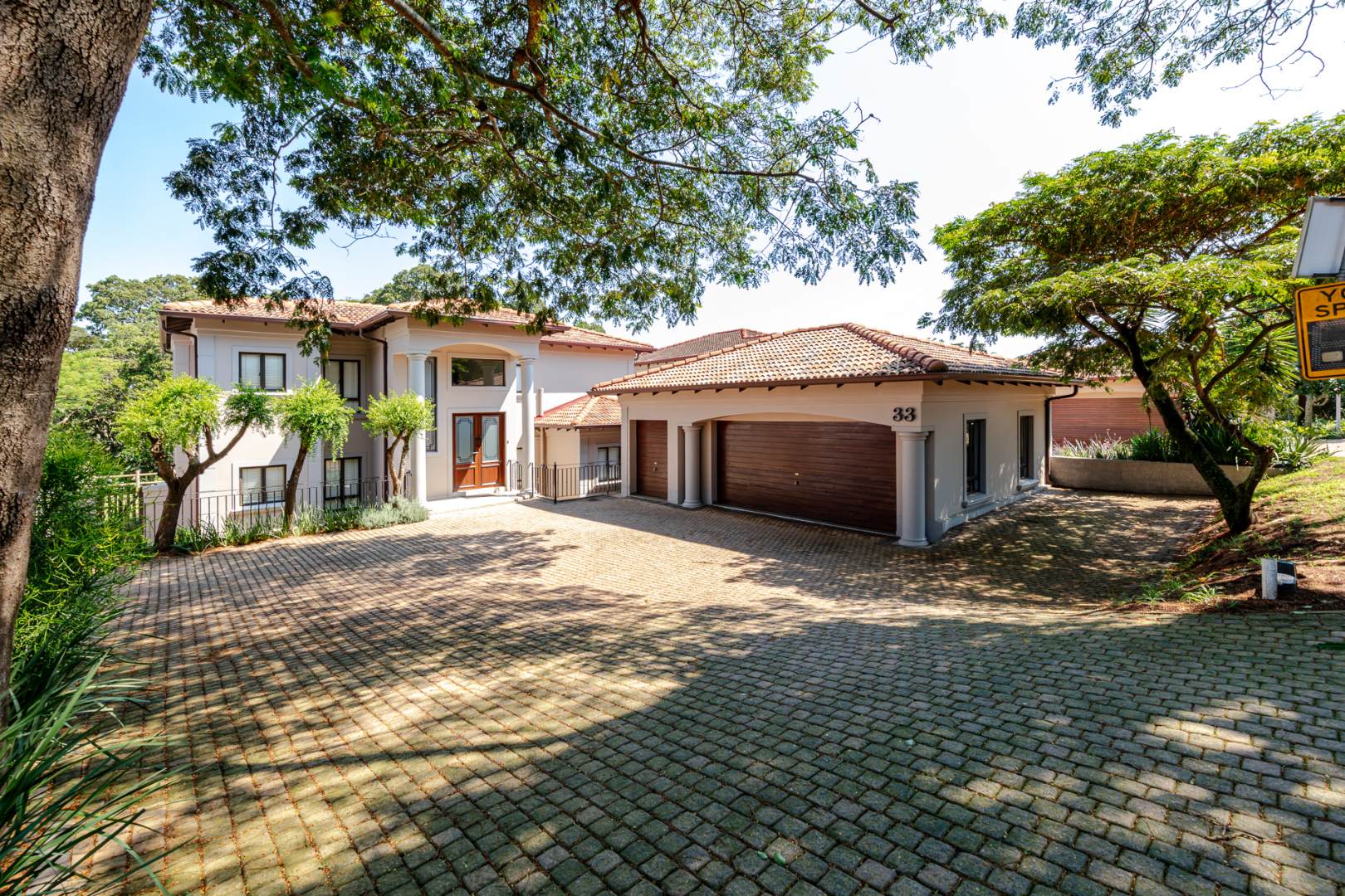 Nestled within the prestigious Umhlali Golf Estate in Ballito, South Africa, this magnificent 4-bedroom residence offers an exceptional lifestyle. The property immediately impresses with its attractive Mediterranean-style architecture, featuring light stucco walls, terracotta roof tiles, and grand double wooden front doors. A spacious paved driveway leads to a two-car and golf cart garage, providing ample parking and a welcoming first impression.