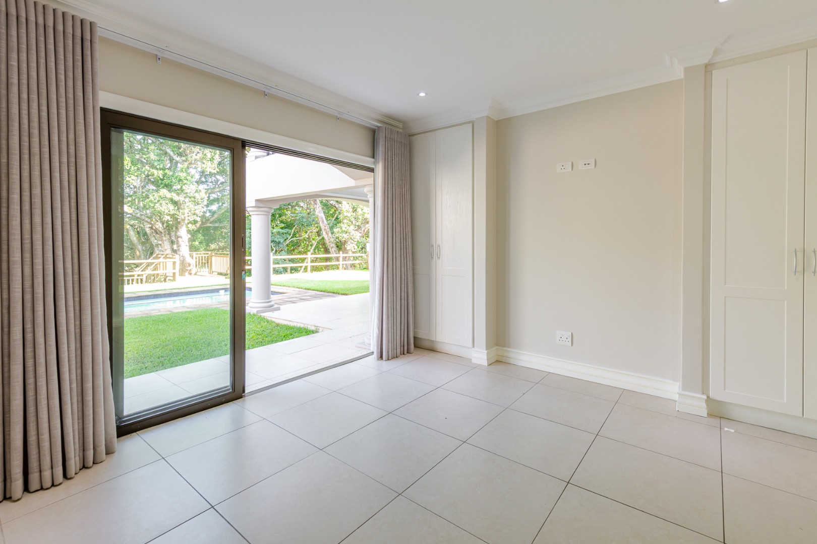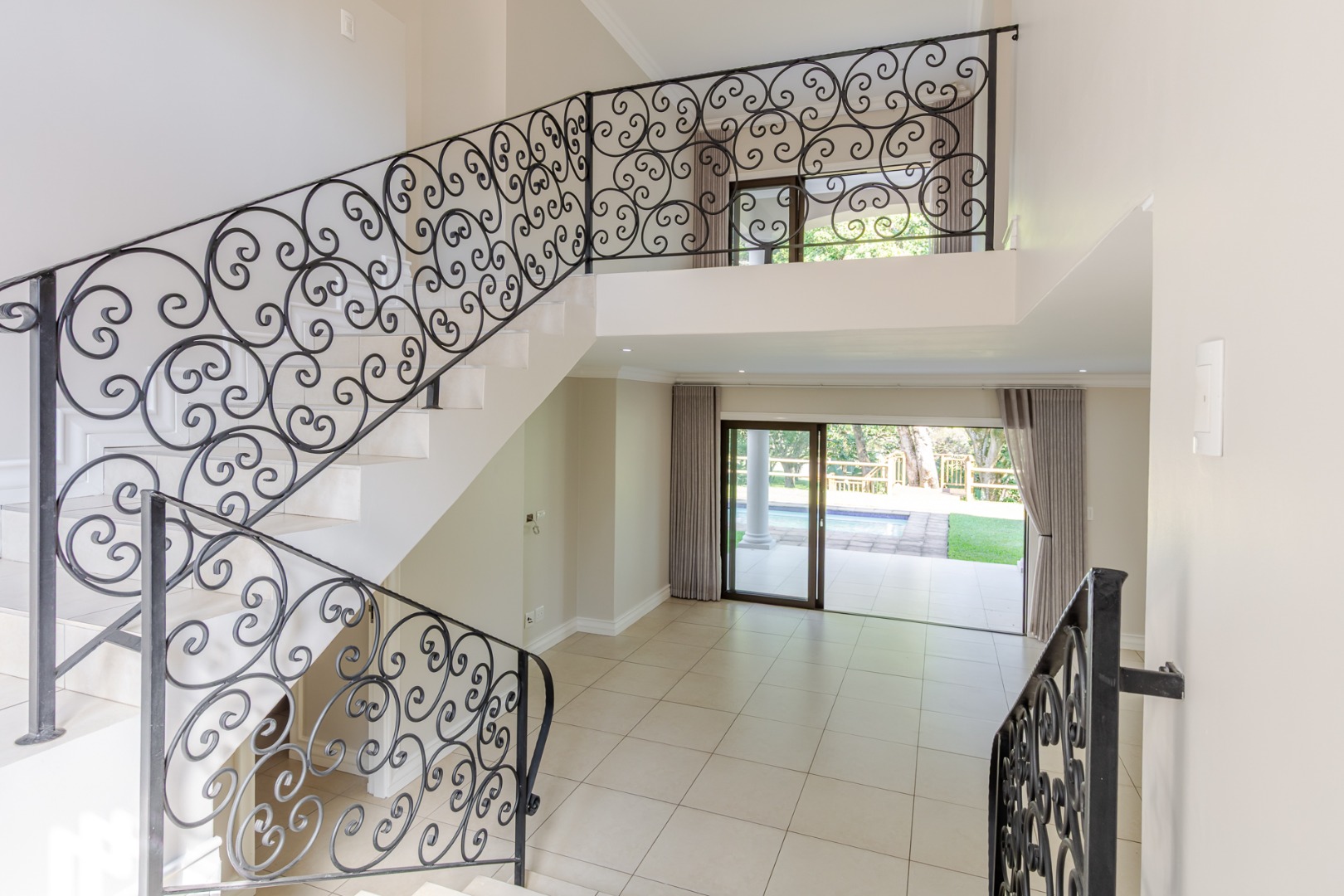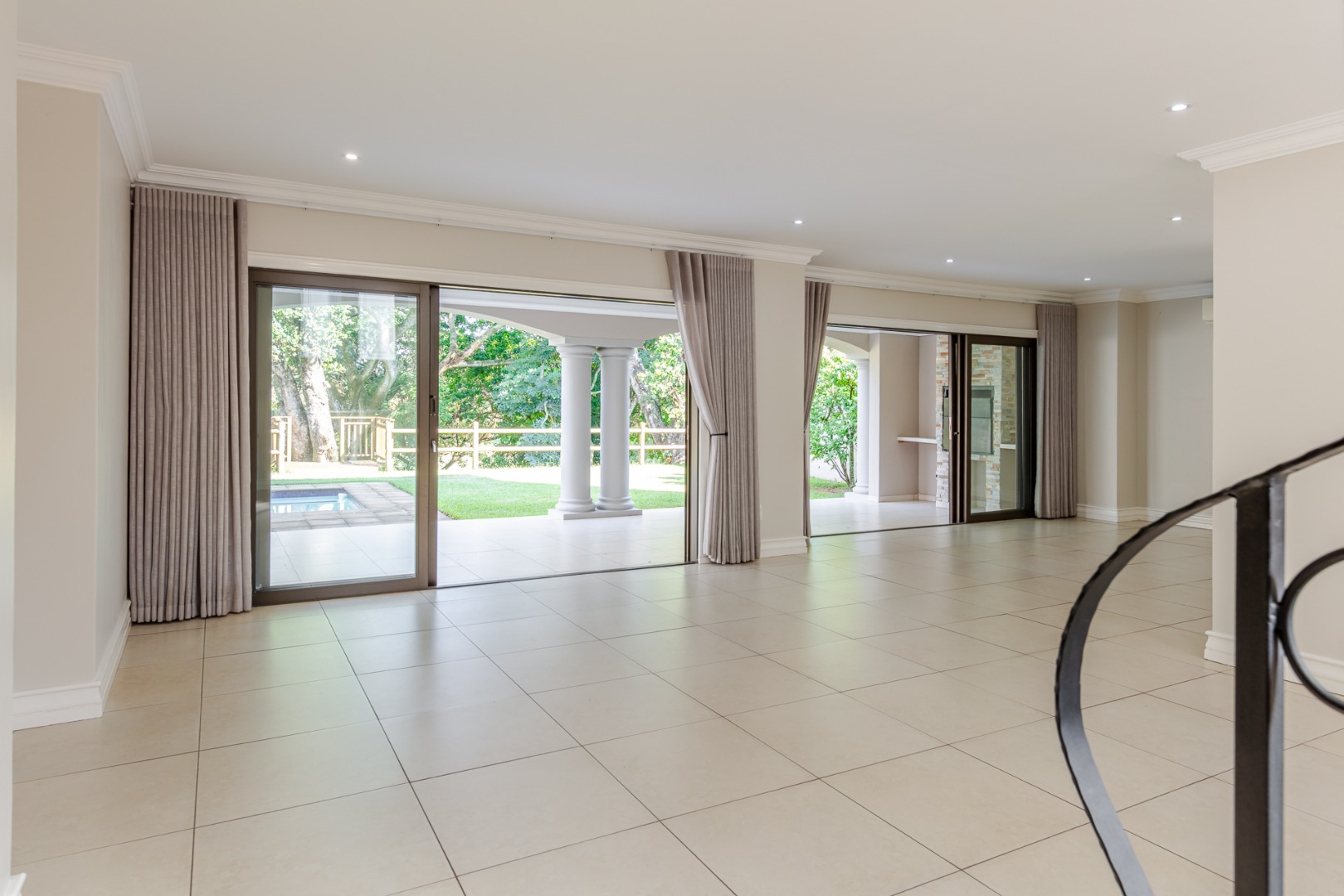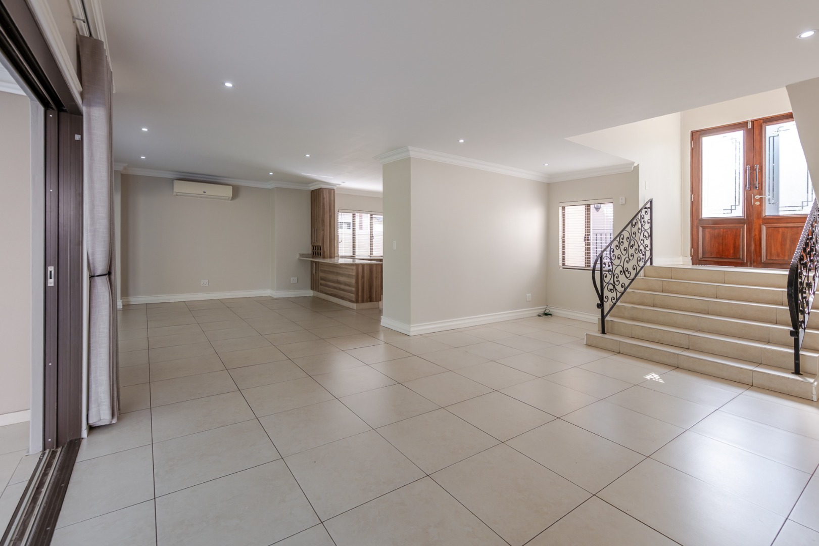 Nestled within the prestigious Umhlali Golf Estate in Ballito, South Africa, this magnificent 4-bedroom residence offers an exceptional lifestyle. The property immediately impresses with its attractive Mediterranean-style architecture, featuring light stucco walls, terracotta roof tiles, and grand double wooden front doors. A spacious paved driveway leads to a two-car and golf cart garage, providing ample parking and a welcoming first impression.