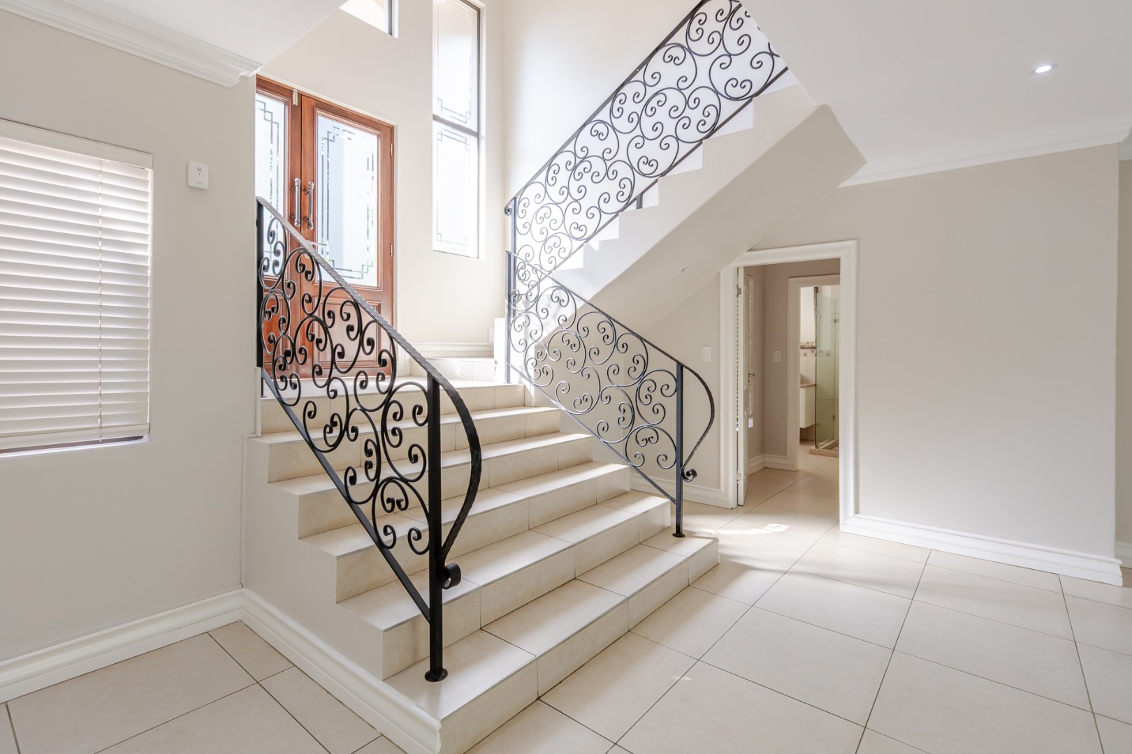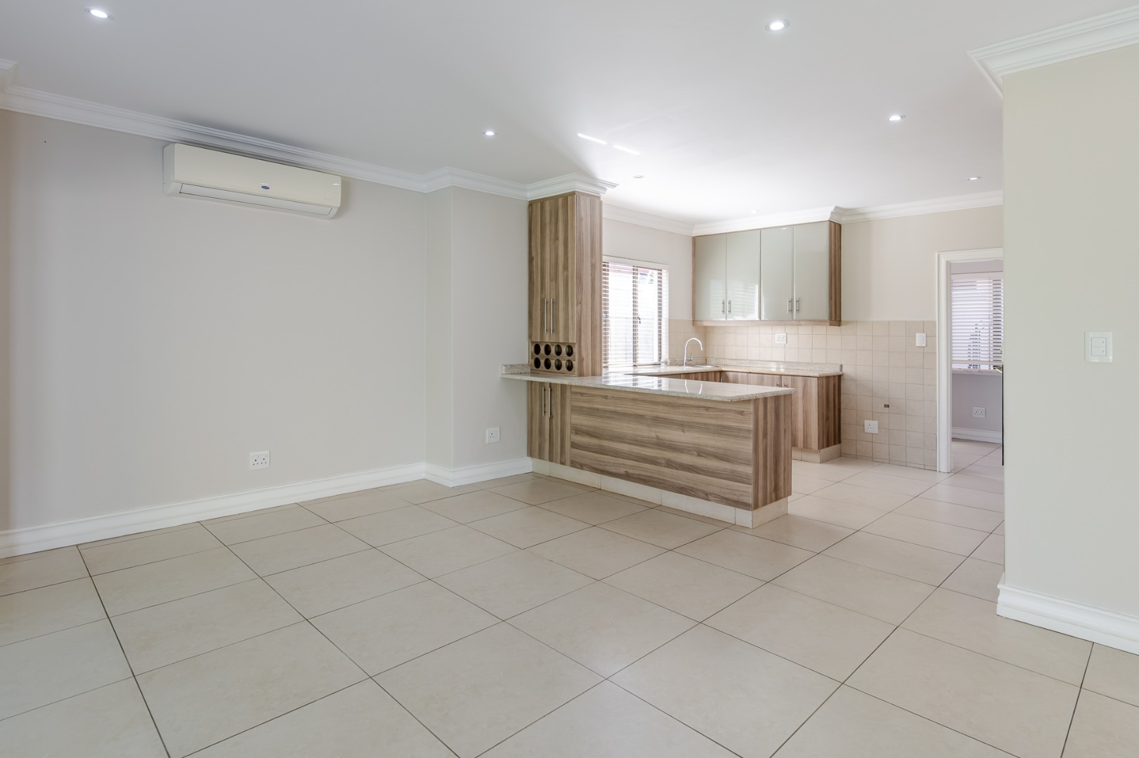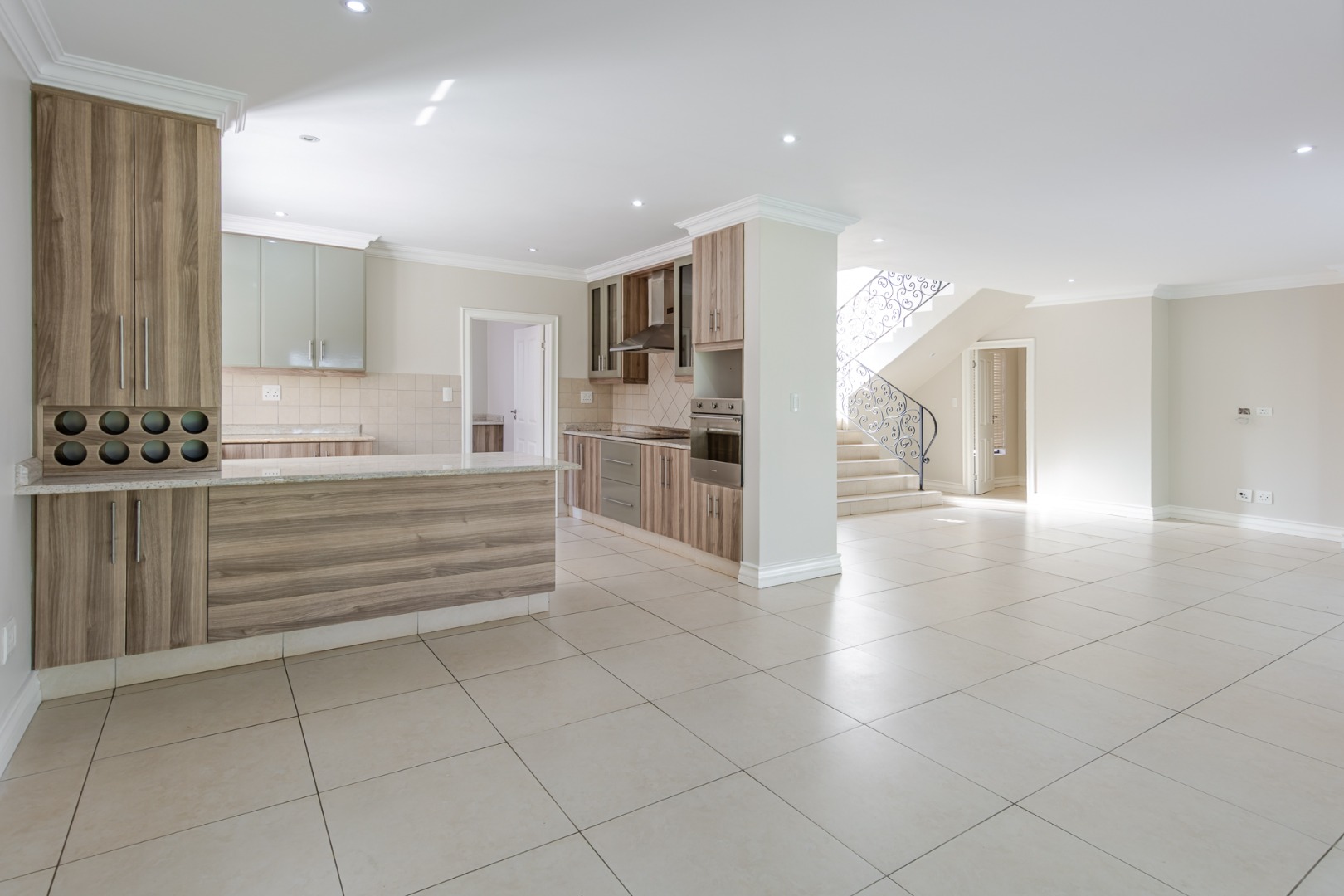 Step inside to a grand double-volume entrance hall that sets an elegant tone. The home boasts a seamless open-plan layout that connects the lounge, dining area and kitchen. Large sliding glass doors invite abundant natural light and facilitate an effortless indoor-outdoor flow. The modern kitchen is lovely, equipped with granite countertops, integrated appliances, wood-look cabinetry, a breakfast bar, and a built-in wine rack. Air conditioning units ensure comfort throughout.