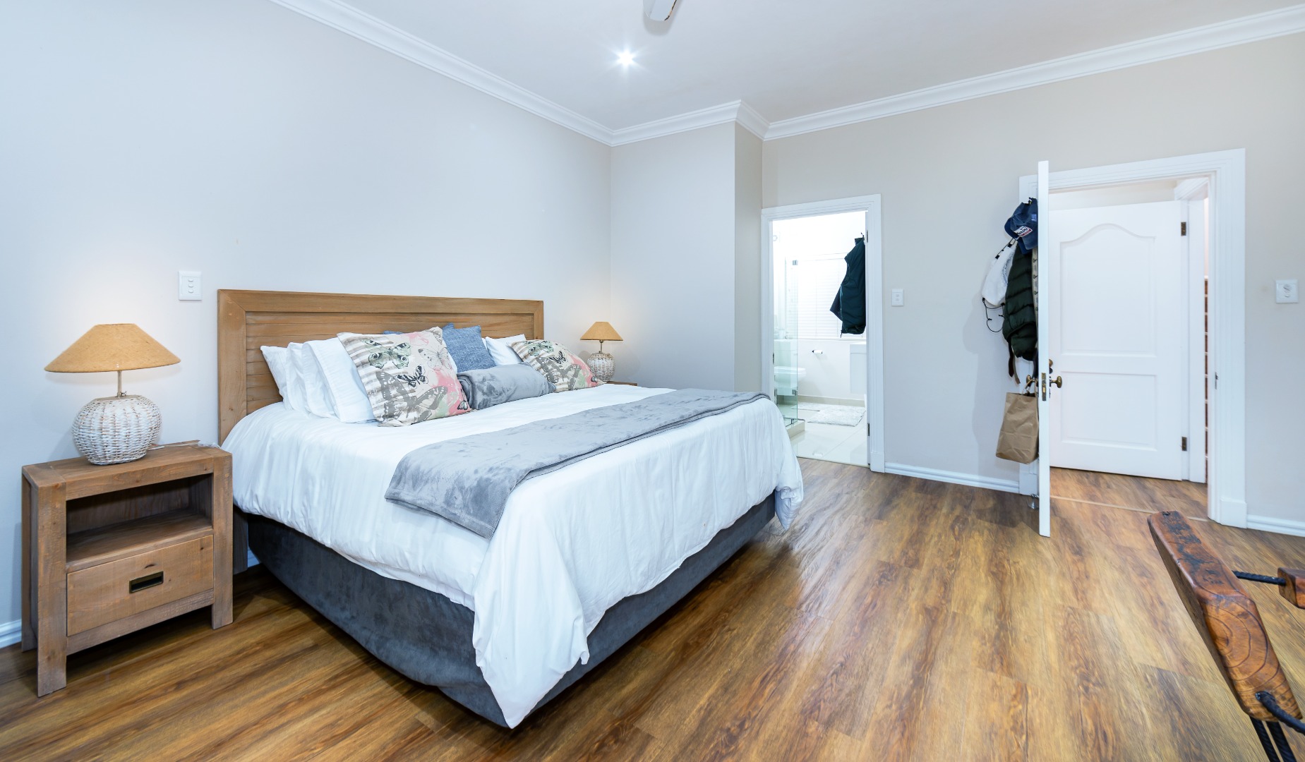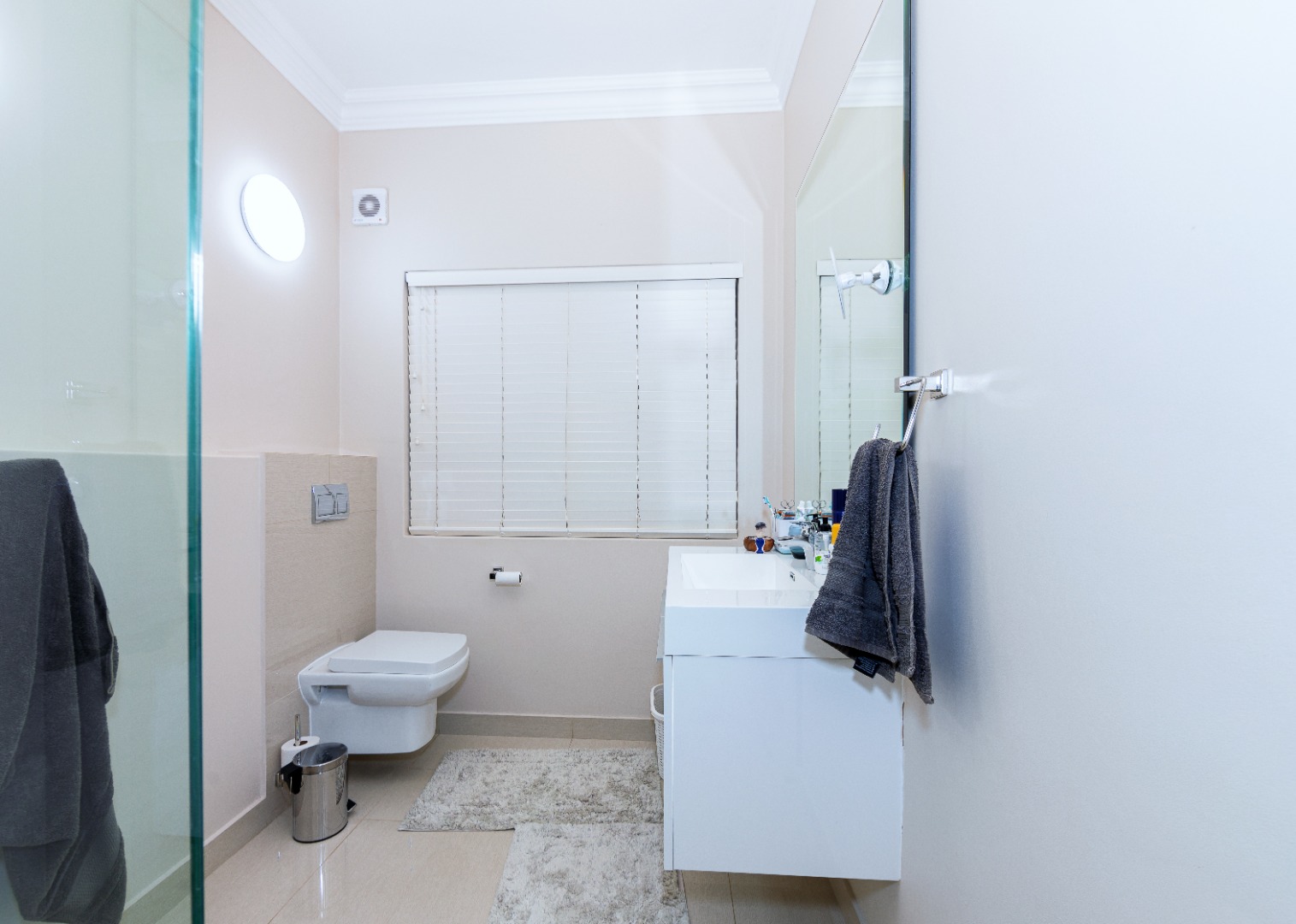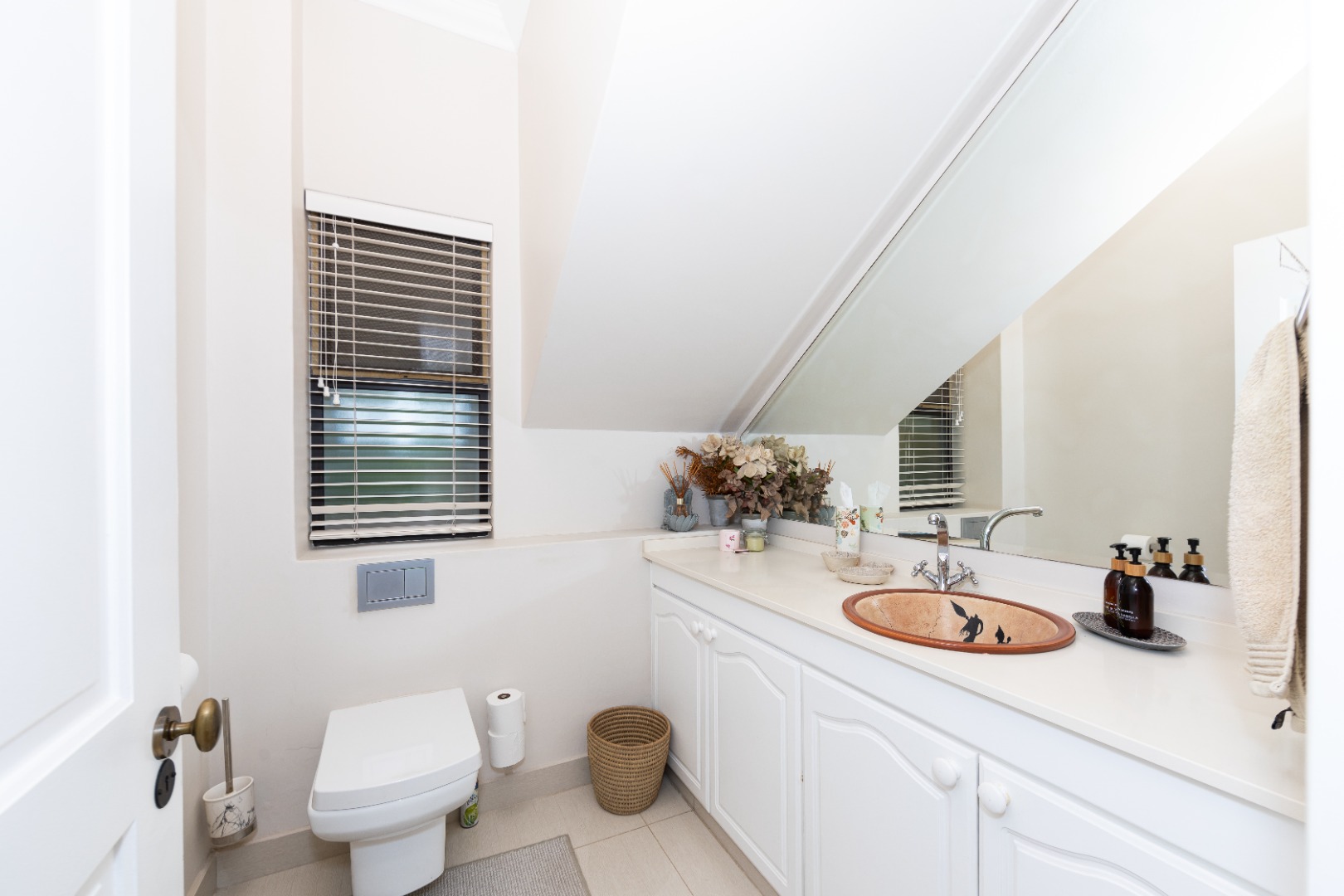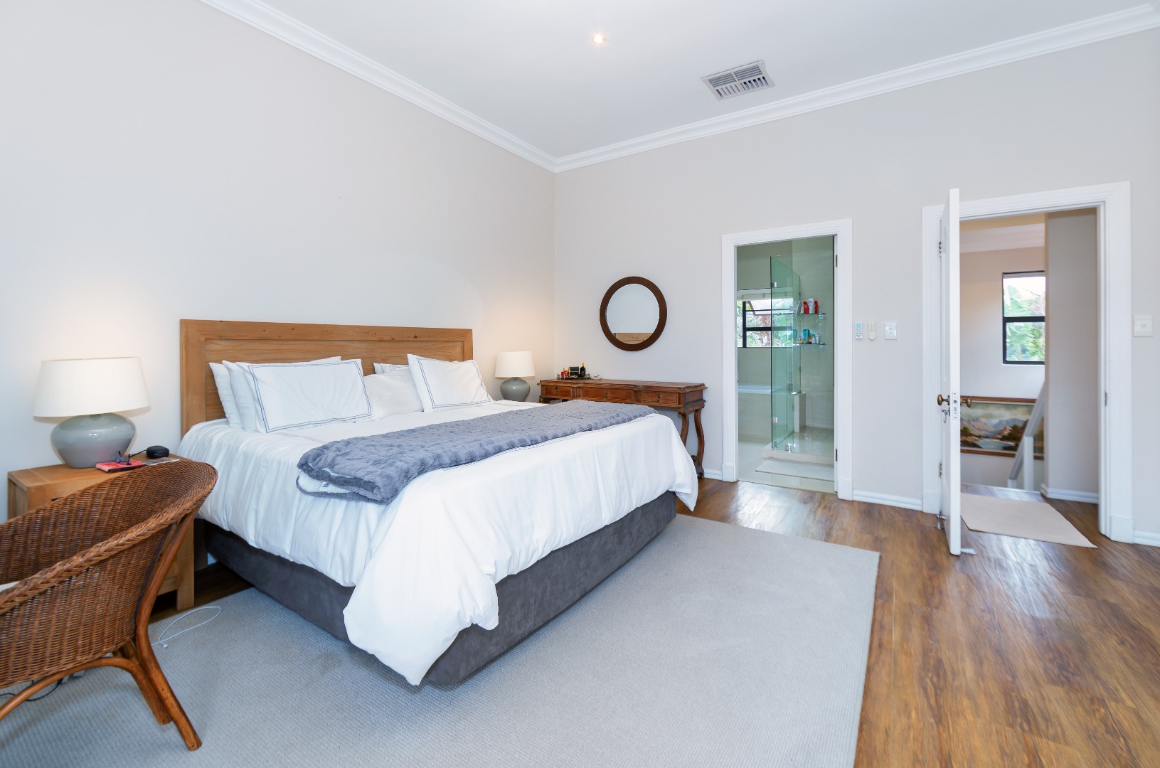 One of the bedrooms is located on the ground level and opens directly onto the patio. The ensuite bathroom is modern and beautifully appointed. The second bedroom is located on the upper level and opens out onto a private balcony, with views across the dam and the wonderful gardens. The large en suite bathroom is modern and spacious.