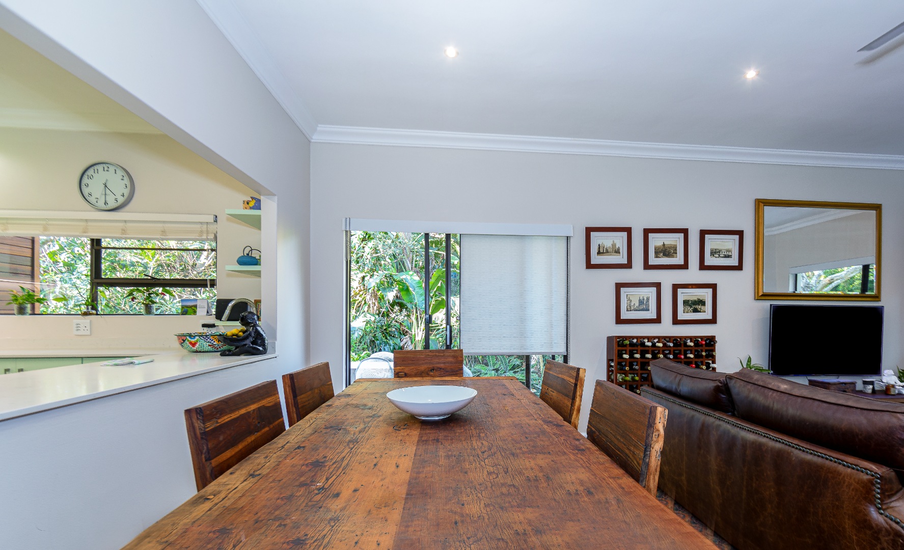 The open plan lounge, dining room, kitchen flow seamlessly through sliding doors, out onto an undercover patio, with views across the dam. Off the dining room is a secluded outdoor dining area, where you can dine under the mature trees and enjoy the wonderful garden.