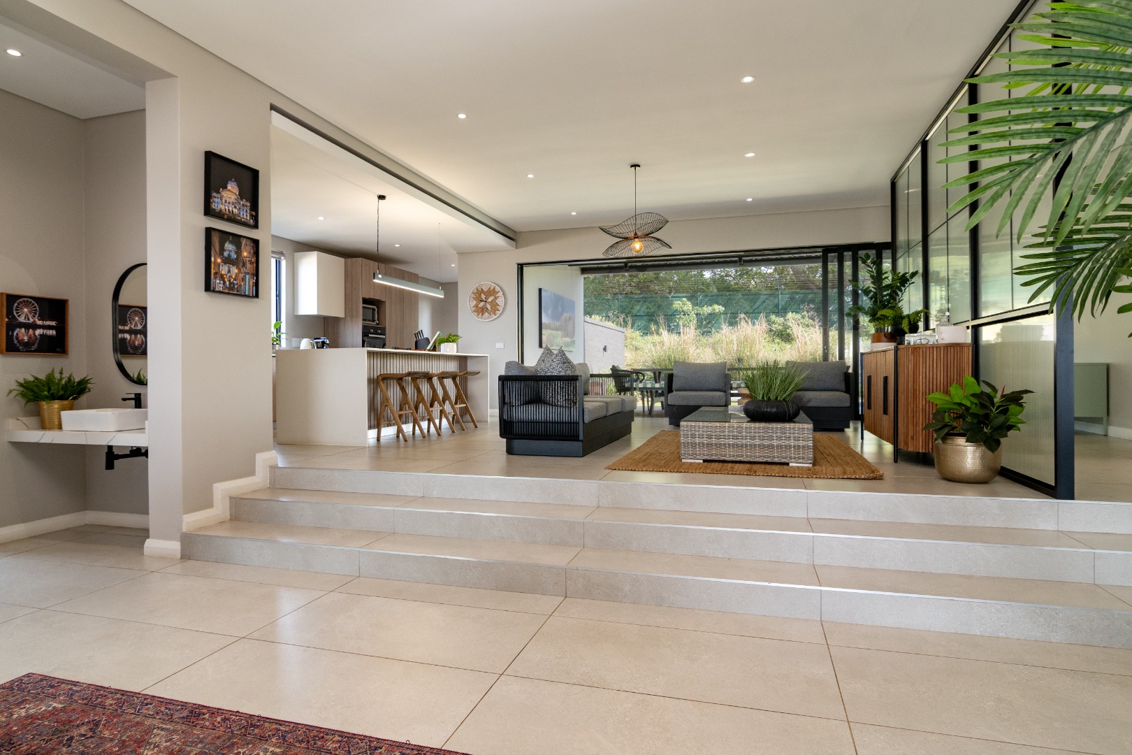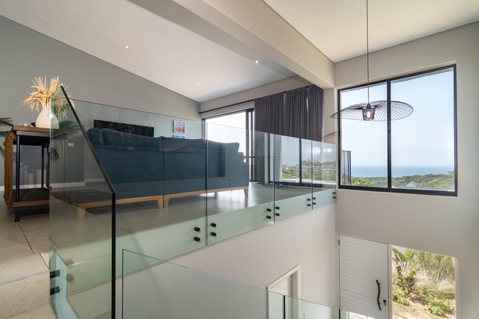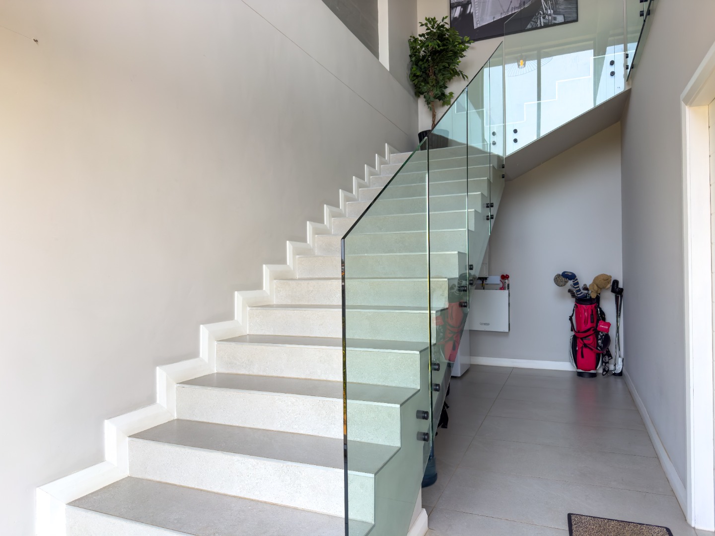 Upon entering, you are welcomed by a striking double-volume entrance hall featuring an elegant staircase that leads to the main living areas. The free-flowing layout maximizes natural light and views, with glass sliding doors opening onto an extended patio on the sea-facing side — the perfect spot to take in the scenery from both the living areas and the master suite. The patio on the other side of the home, flows effortlessly to the garden and pool area, designed with privacy in mind and sheltered from the prevailing coastal winds.