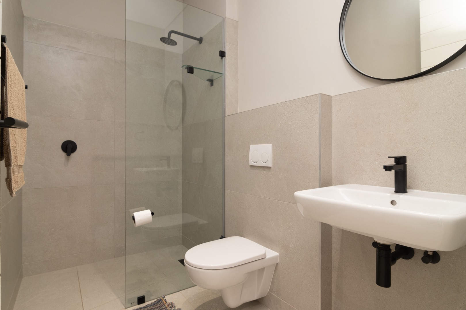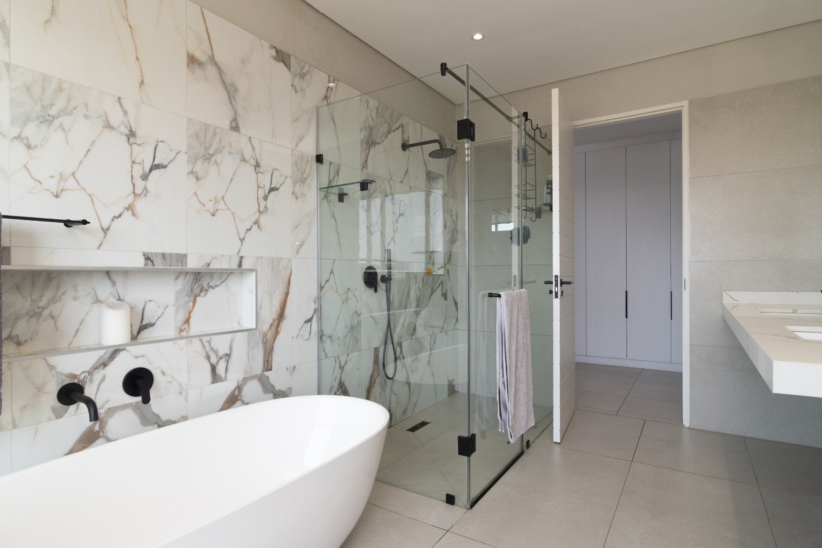 The main suite is a luxurious retreat, featuring a spacious wardrobe area that leads into a modern bathroom with double vanities, a large shower, and a freestanding bathtub. The additional two bedrooms are generously sized, each with its own en-suite bathroom with a shower.