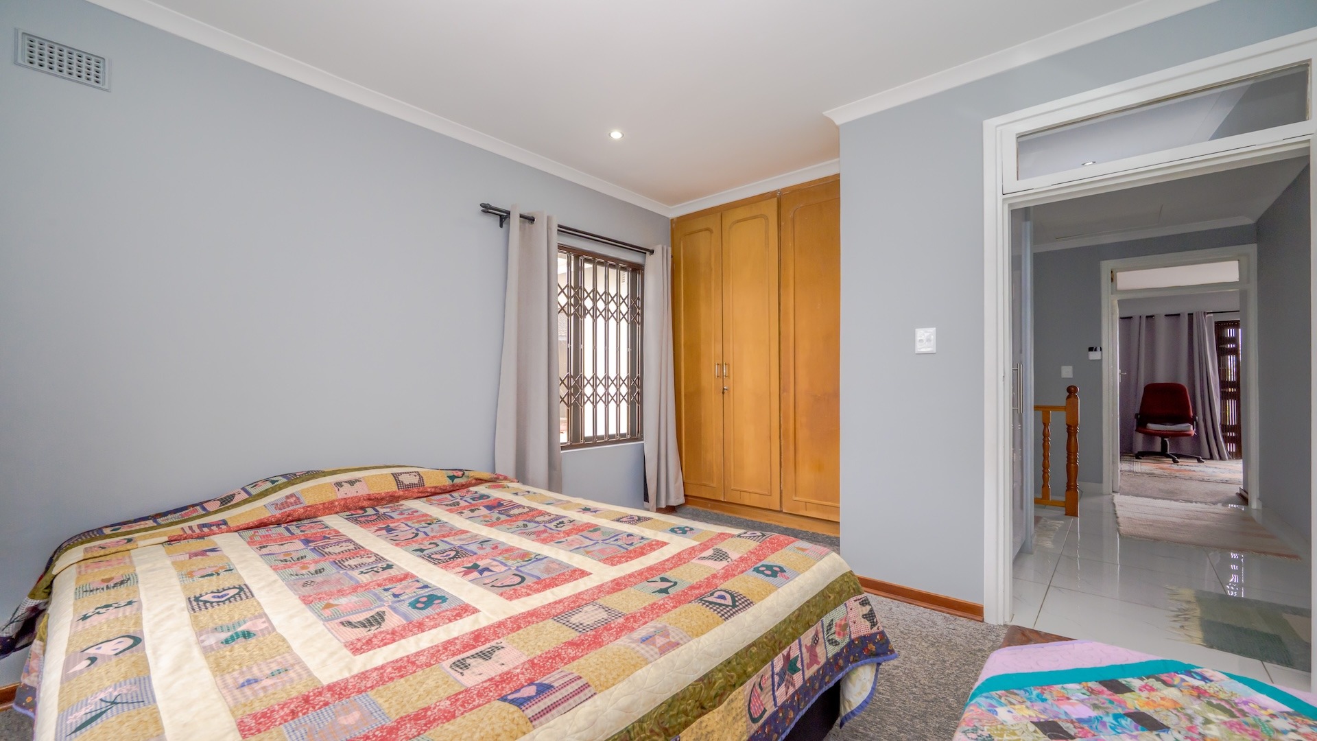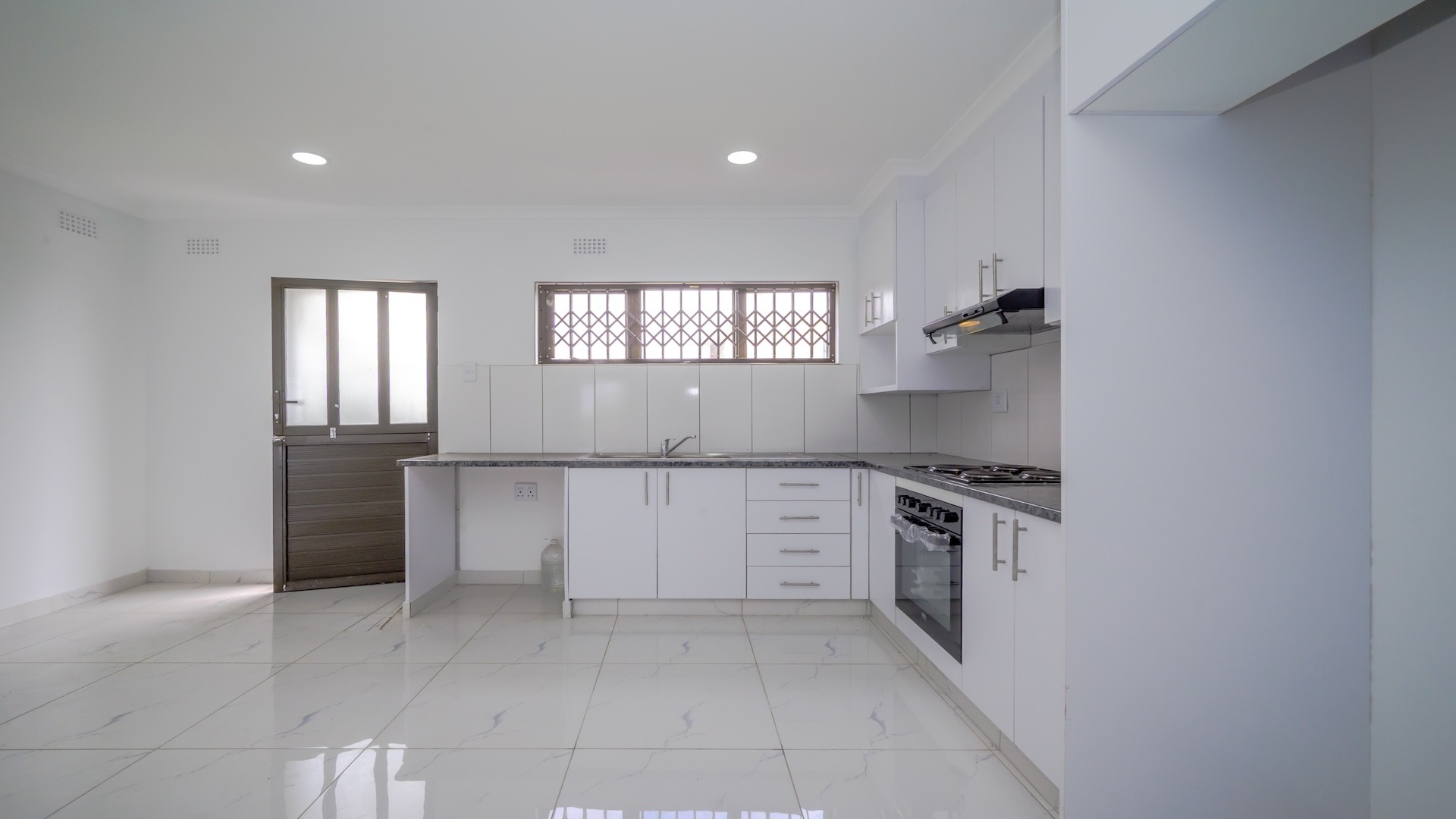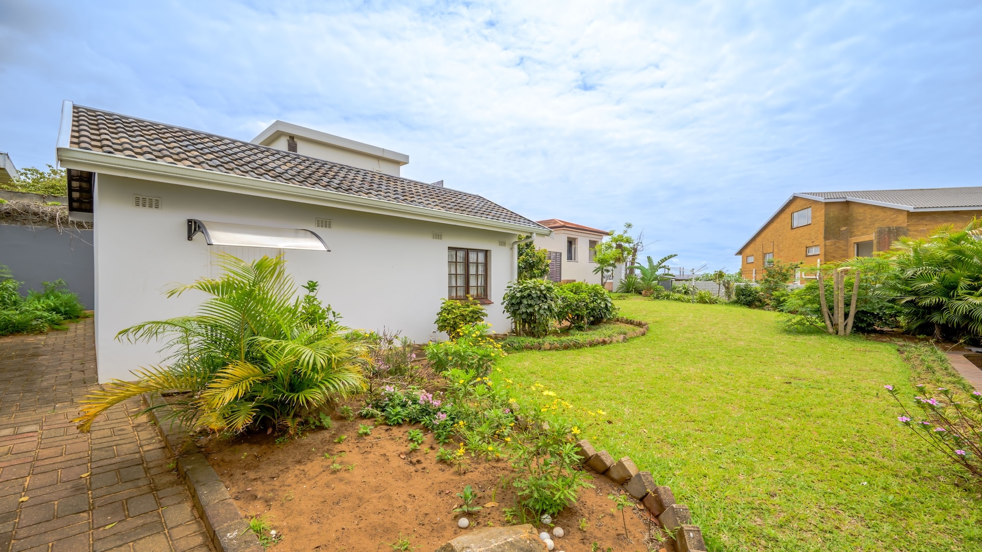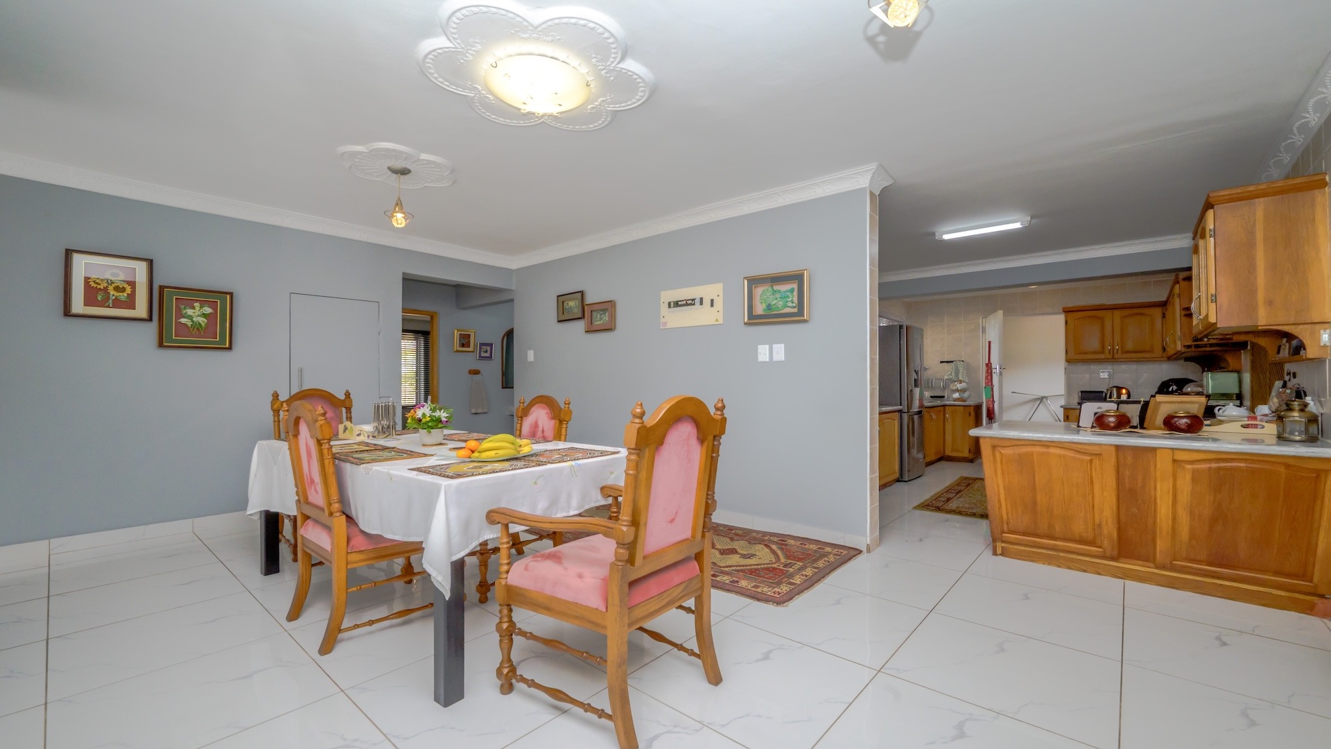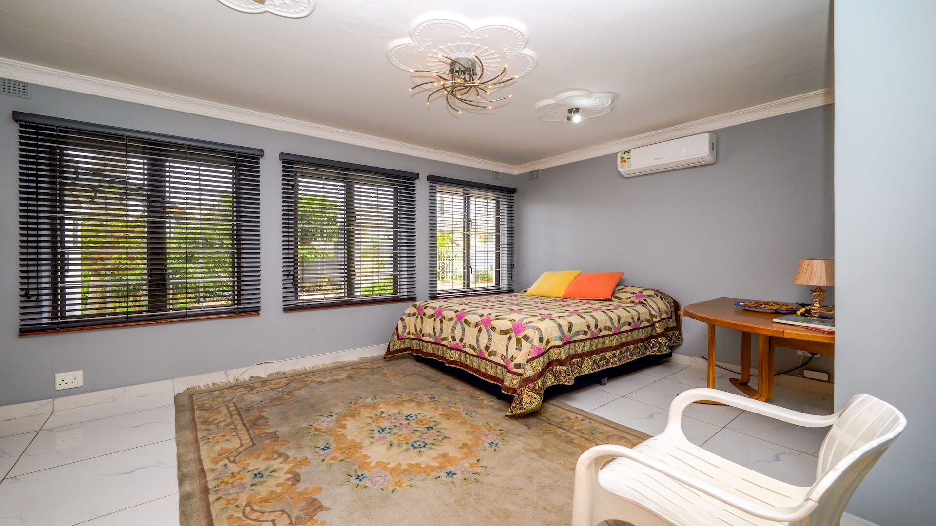 This impressive 4-bedroom, 3-bathroom residence in Desainagar offers comfort and functionality. The property features a modern white exterior with an upper-level balcony and a partially landscaped garden. Inside, find two spacious lounges and a dining room. The modern kitchen boasts new white cabinetry, dark countertops, and integrated appliances, flowing into an open-plan area. A notable flatlet potential exists, accessible via an external staircase. Outdoor amenities include a brick patio, a large paved driveway, and three garages. Pets are allowed. Located in Desainagar, this home provides a serene suburban lifestyle. Key Features: * 4 Bedrooms, 3 Bathrooms * 2 Lounges, 1 Dining Room * Modern Kitchen with New Appliances * Flatlet Potential with External Access * 3 Garages, 4 Parking Bays * Balcony and Patio * Landscaped Garden, Paved Driveway * Pet-Friendly