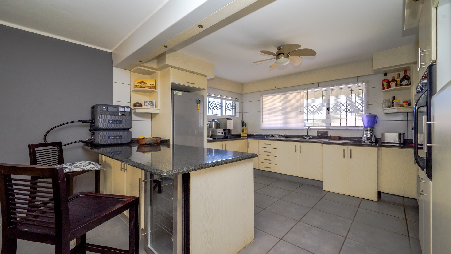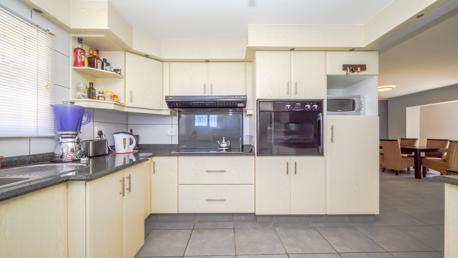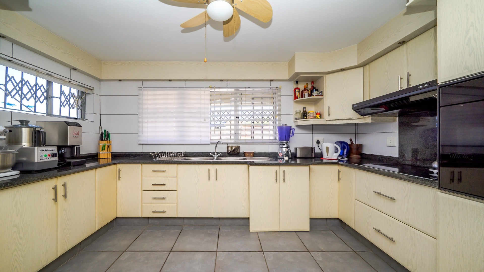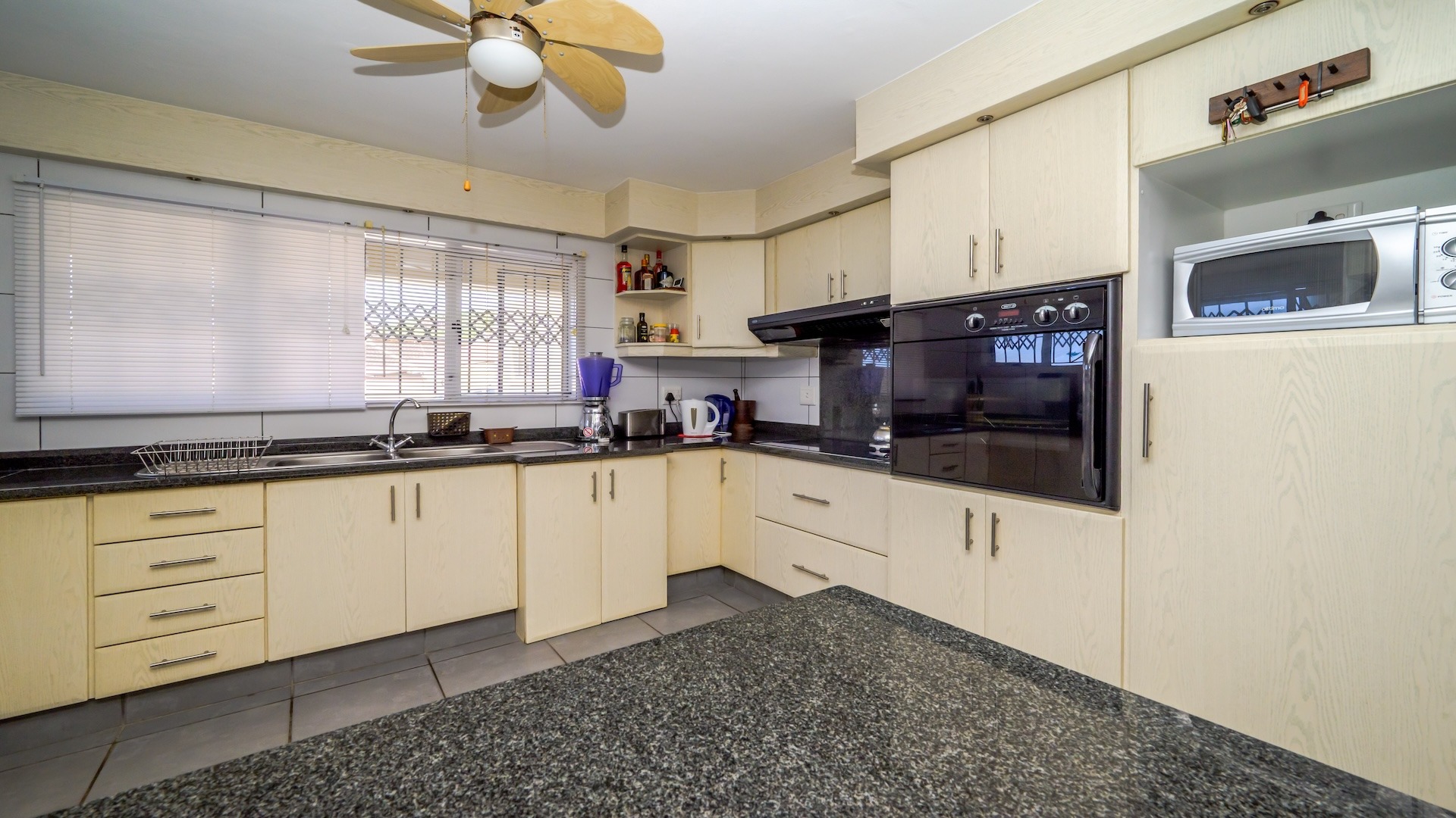 Spanning 226 sqm, the interior features a well-appointed lounge and a dedicated dining room, perfect for entertaining. The functional U-shaped kitchen is equipped with ample light-colored cabinetry, dark granite-style countertops, and a built-in oven, with natural light and a ceiling fan for comfort.