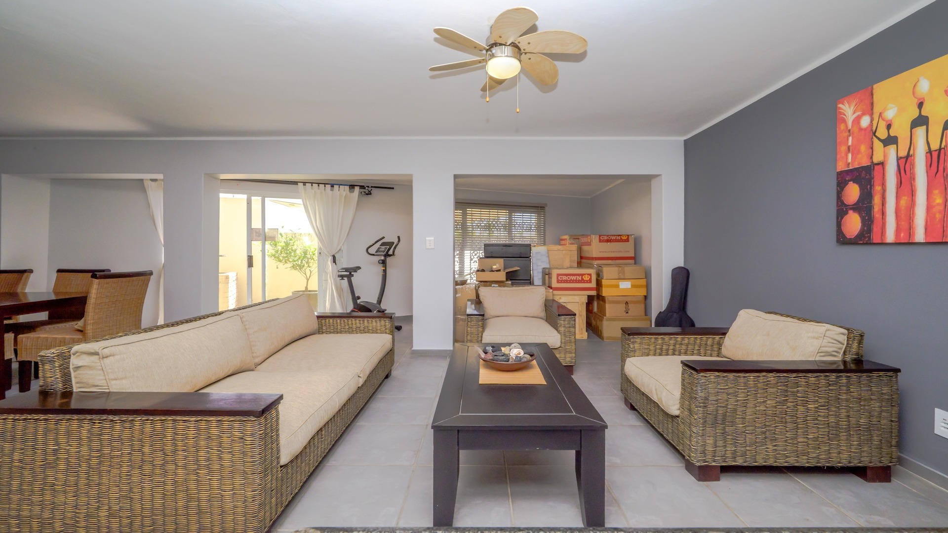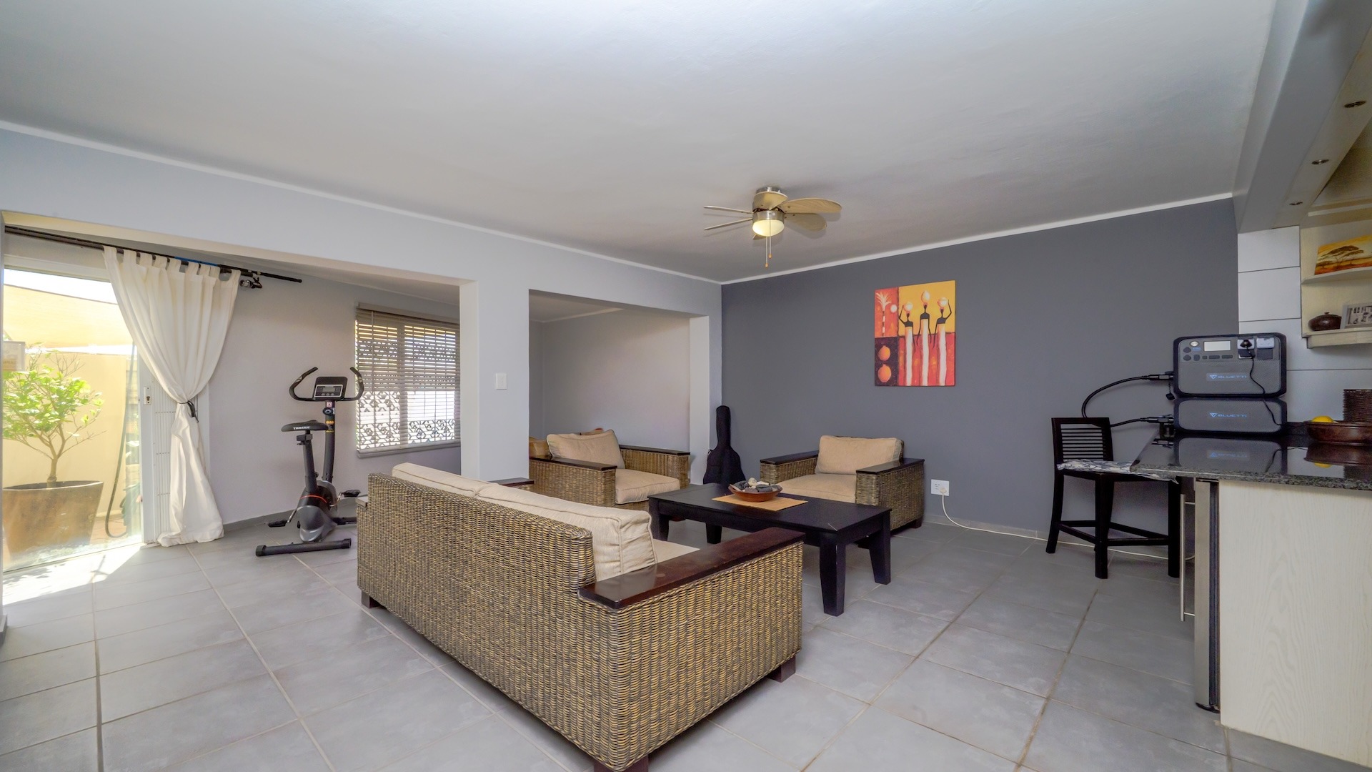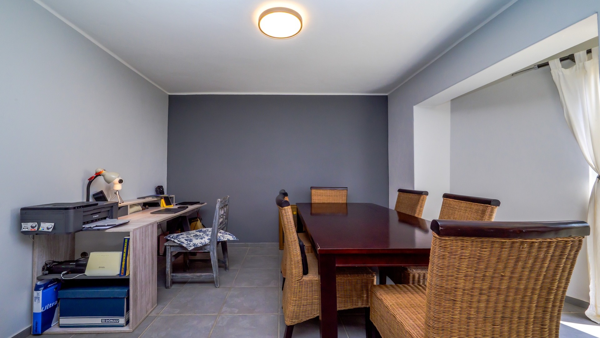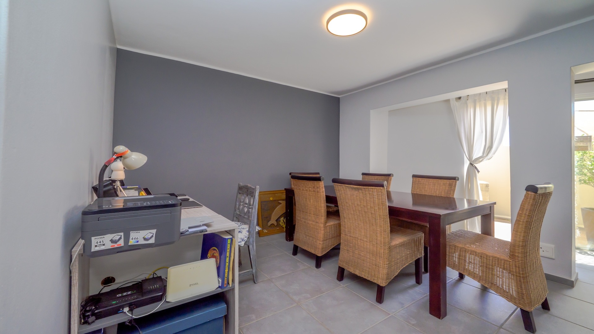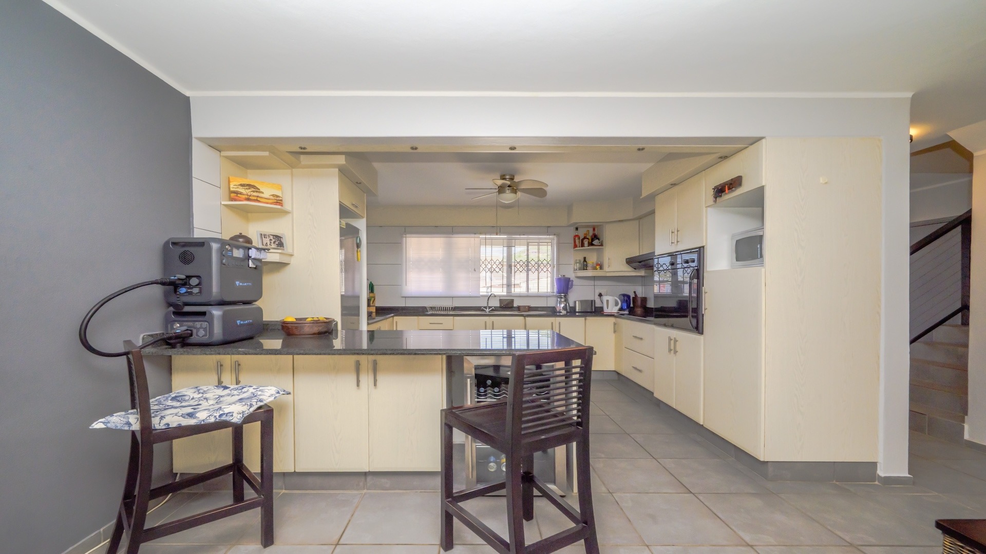Spanning 226 sqm, the interior features a well-appointed lounge and a dedicated dining room, perfect for entertaining. The functional U-shaped kitchen is equipped with ample light-colored cabinetry, dark granite-style countertops, and a built-in oven, with natural light and a ceiling fan for comfort.