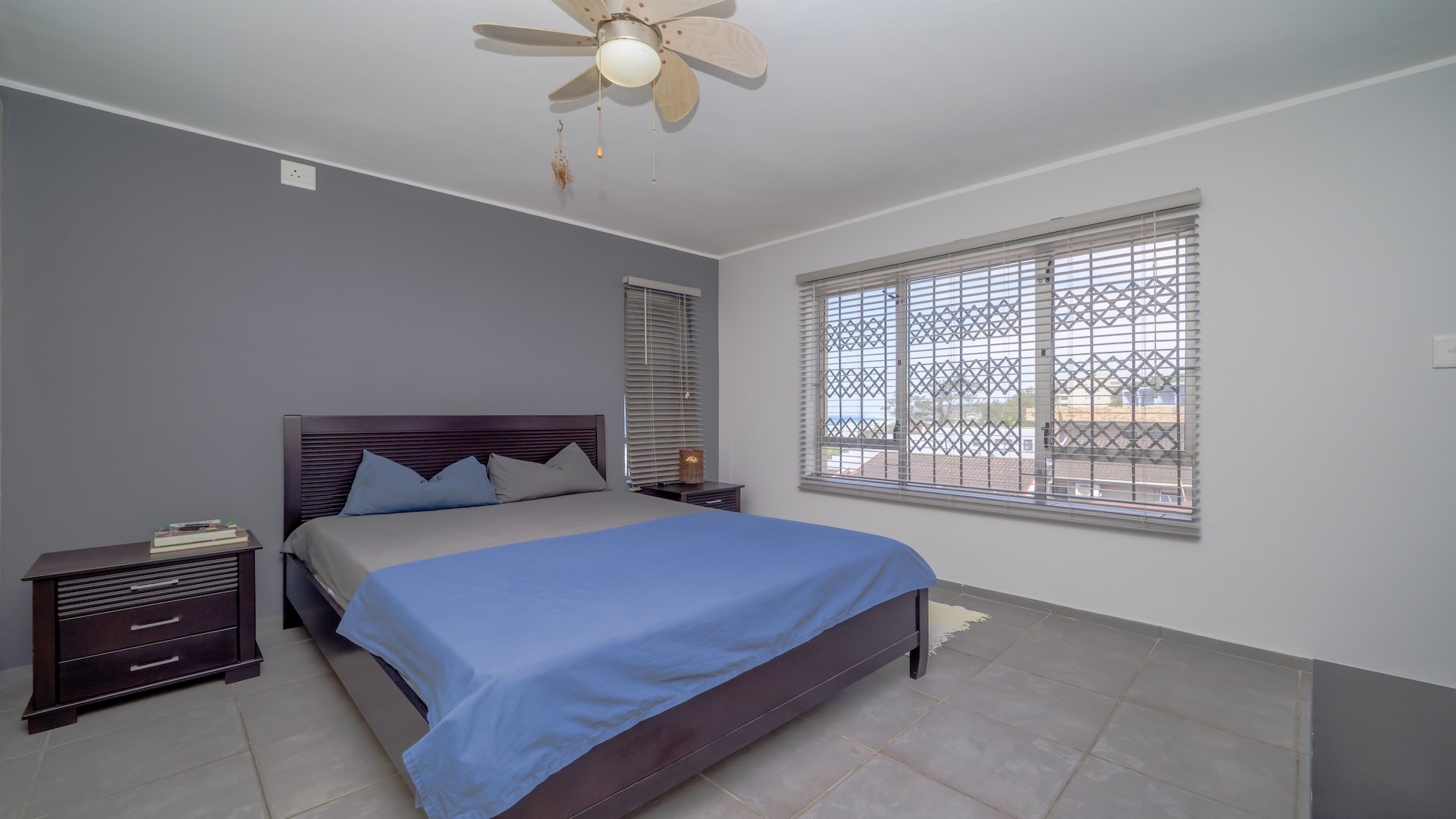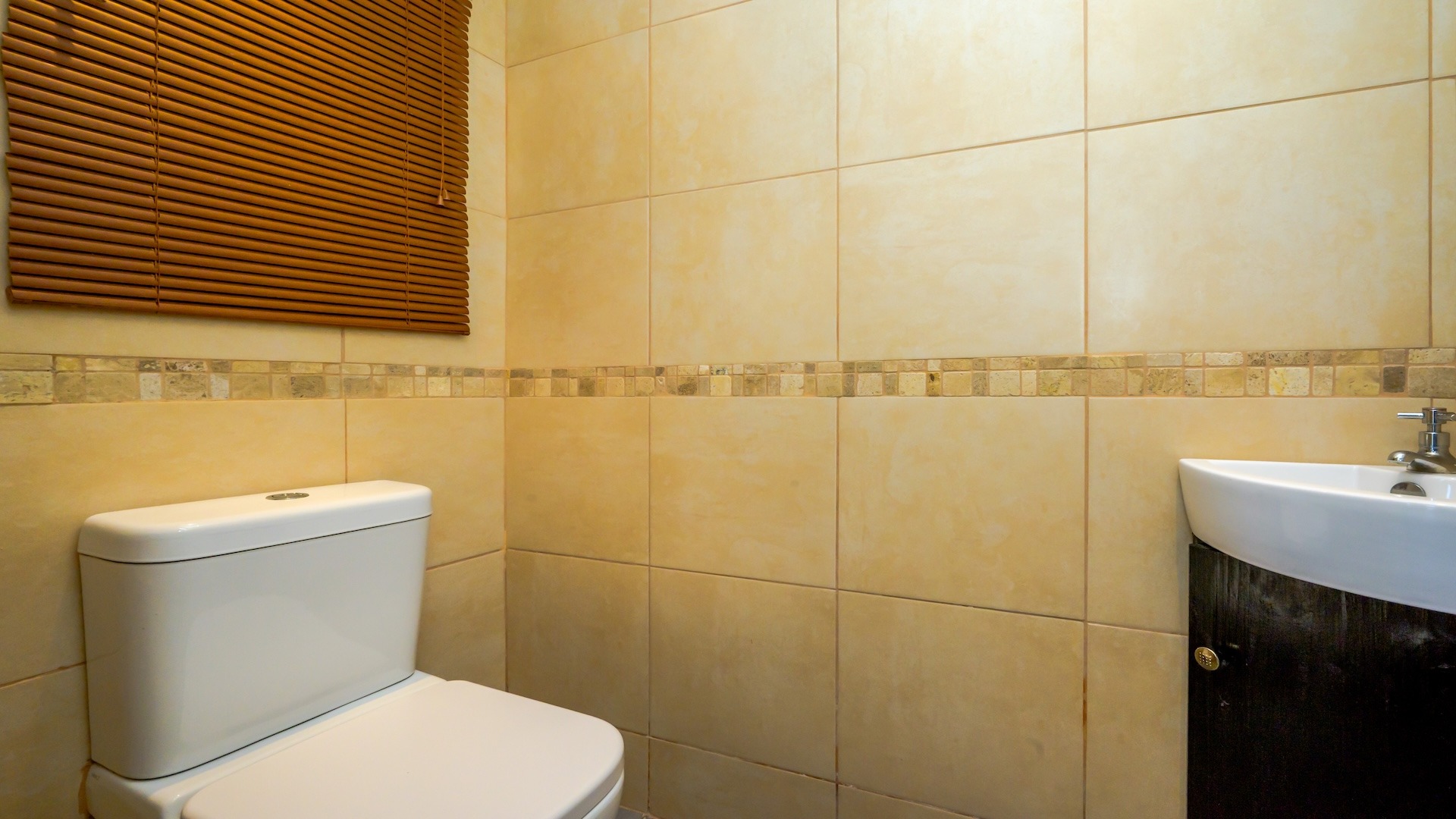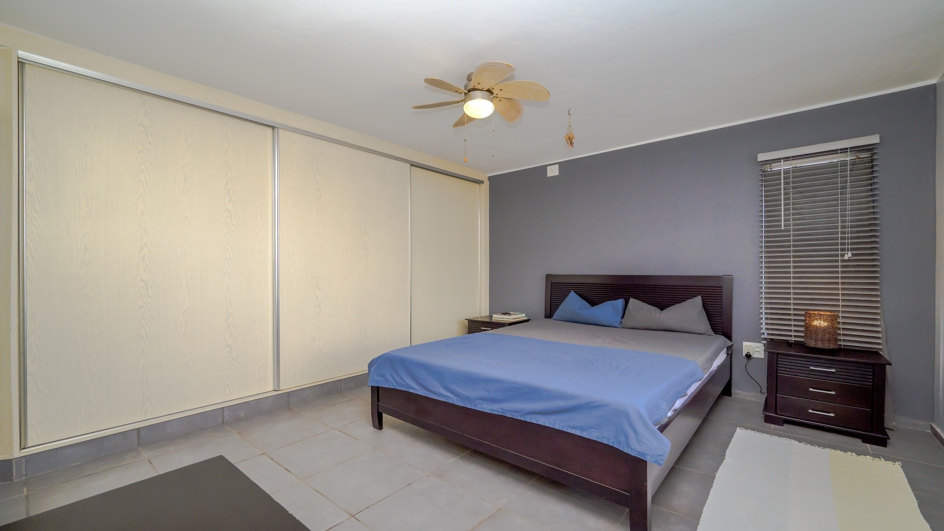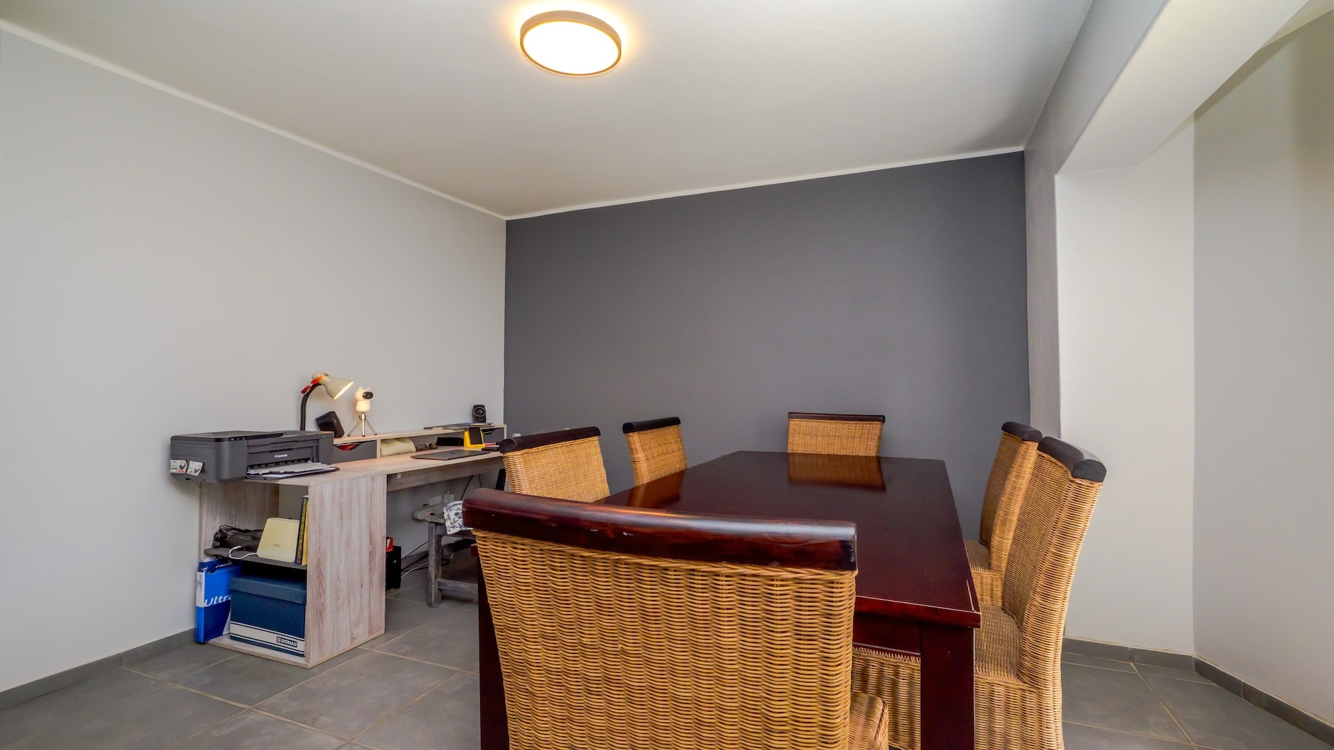 Spanning 226 sqm, the interior features a well-appointed lounge and a dedicated dining room, perfect for entertaining. The functional U-shaped kitchen is equipped with ample light-colored cabinetry, dark granite-style countertops, and a built-in oven, with natural light and a ceiling fan for comfort.