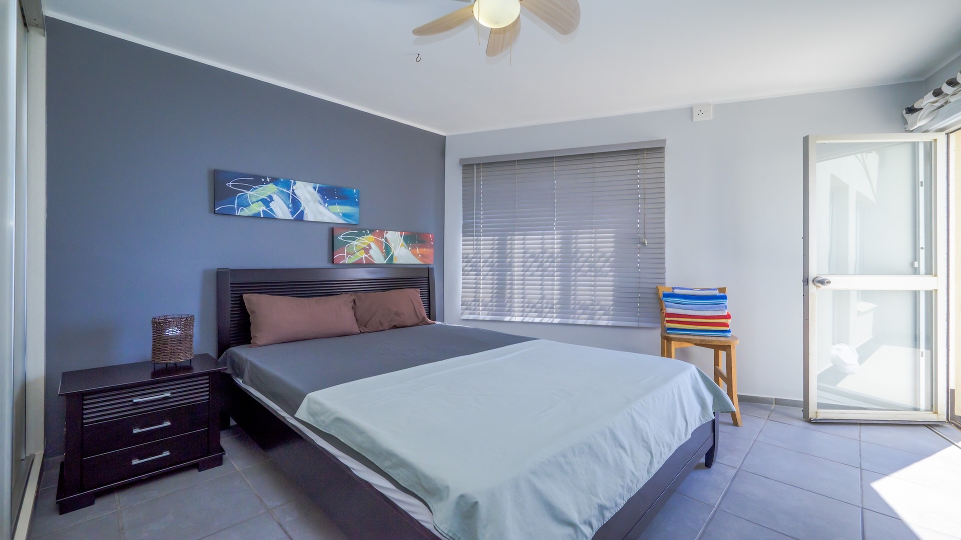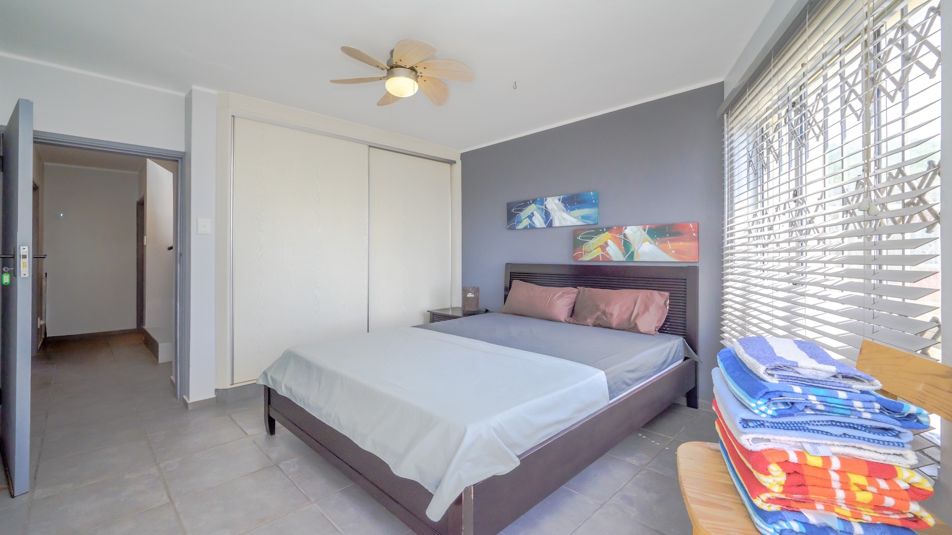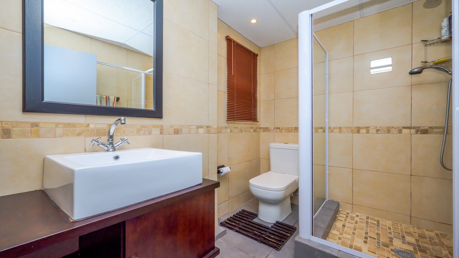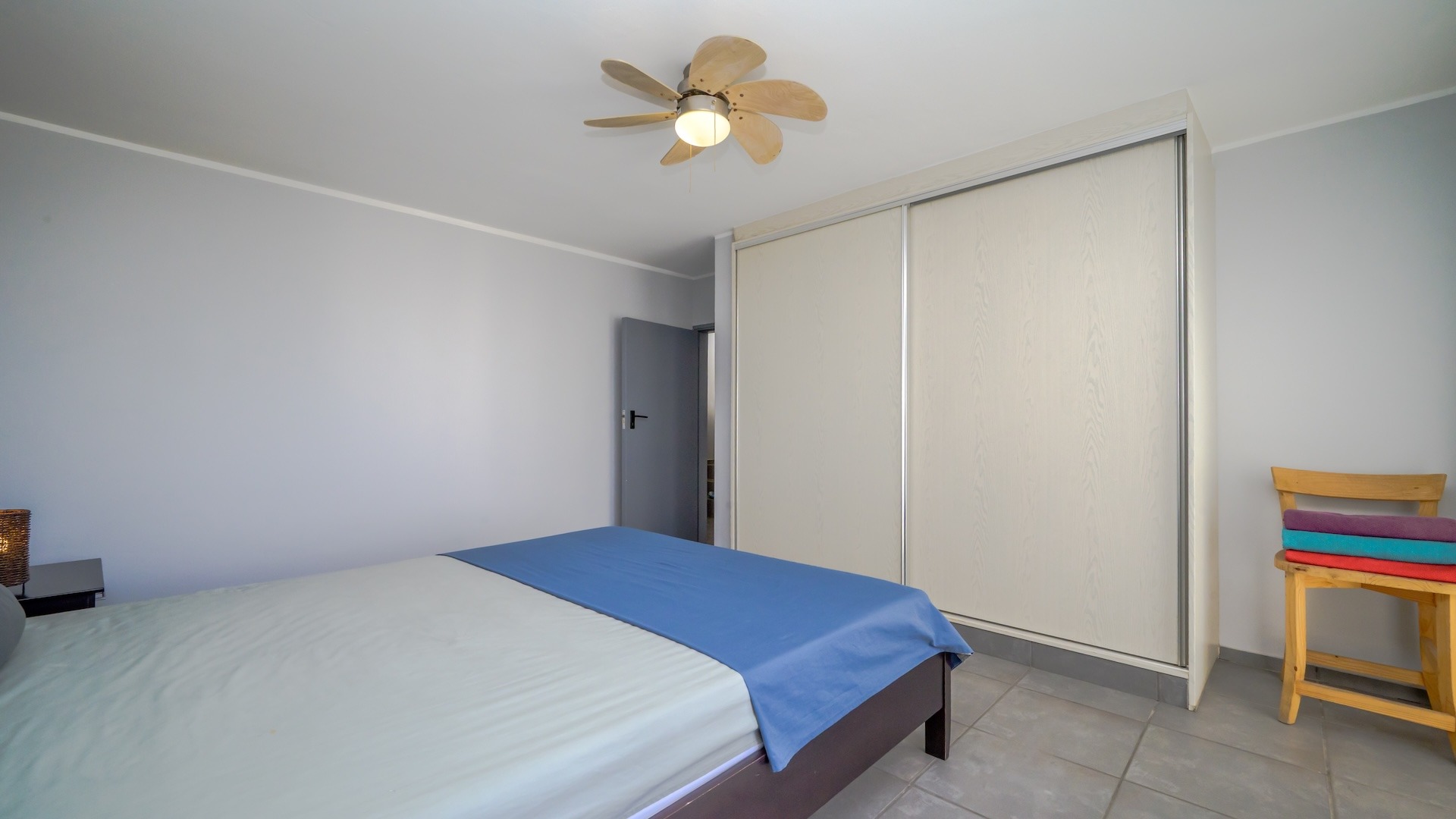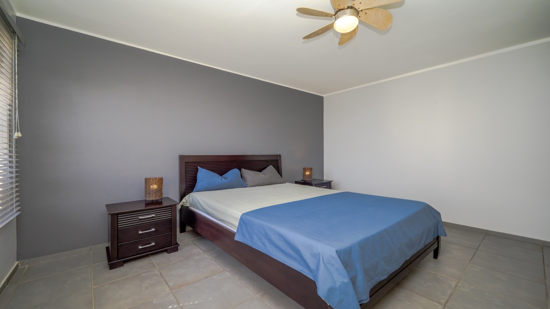 Spanning 226 sqm, the interior features a well-appointed lounge and a dedicated dining room, perfect for entertaining. The functional U-shaped kitchen is equipped with ample light-colored cabinetry, dark granite-style countertops, and a built-in oven, with natural light and a ceiling fan for comfort.