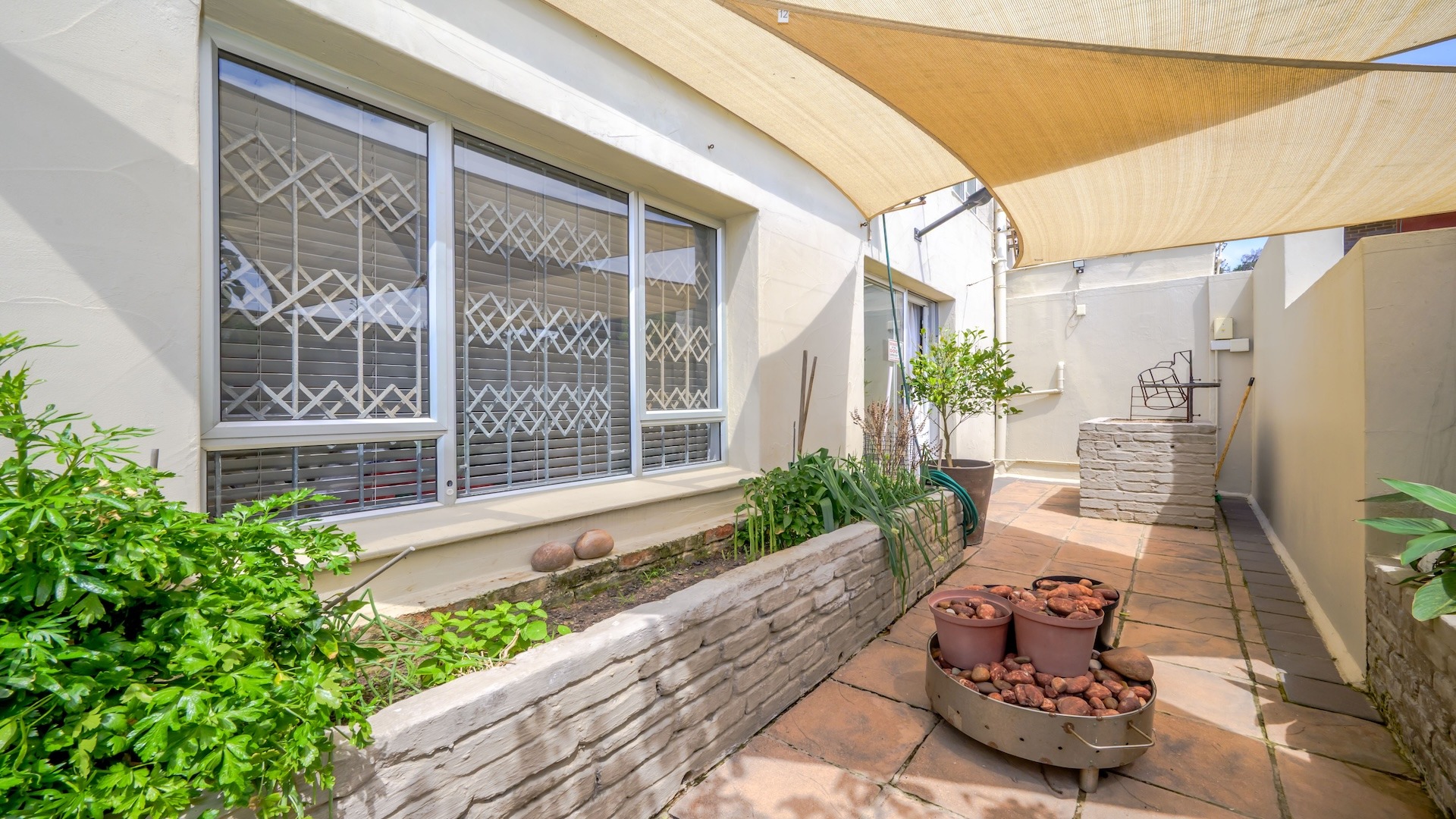 Three comfortable bedrooms and two bathrooms, including one ensuite, ensure ample space and privacy. Outdoors, a private swimming pool area with lounge chairs and tropical palm trees offers ideal relaxation. A single garage and additional parking space provide secure vehicle accommodation.
