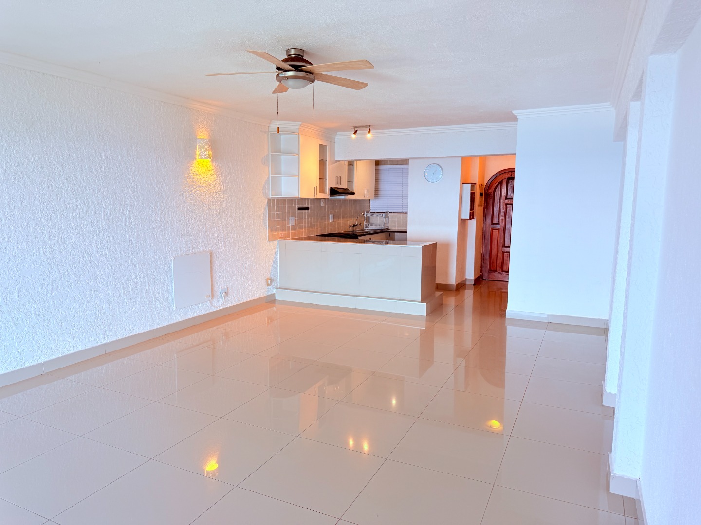 Inside, the residence unfolds into a seamless open-plan living and dining area, adorned with gleaming light-colored tiled floors and a neutral white palette, ready for your personal touch. The contemporary kitchen, featuring a breakfast bar, dark countertops, and ample cabinetry, is designed for both culinary artistry and effortless entertaining.