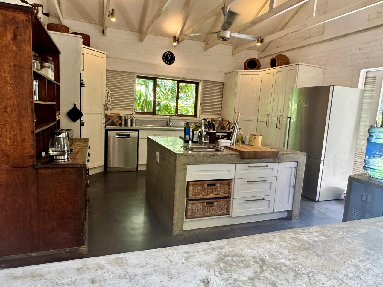 The kitchen is designed for easy, understated entertaining. Contemporary concrete countertops and fully opening shutters allow it to flow directly into the adjacent courtyard, this is an entertainers dream.
