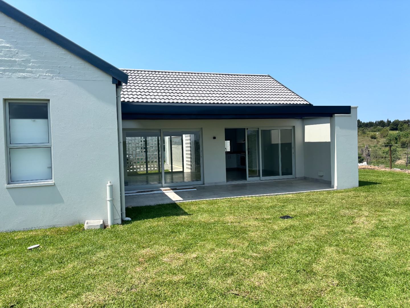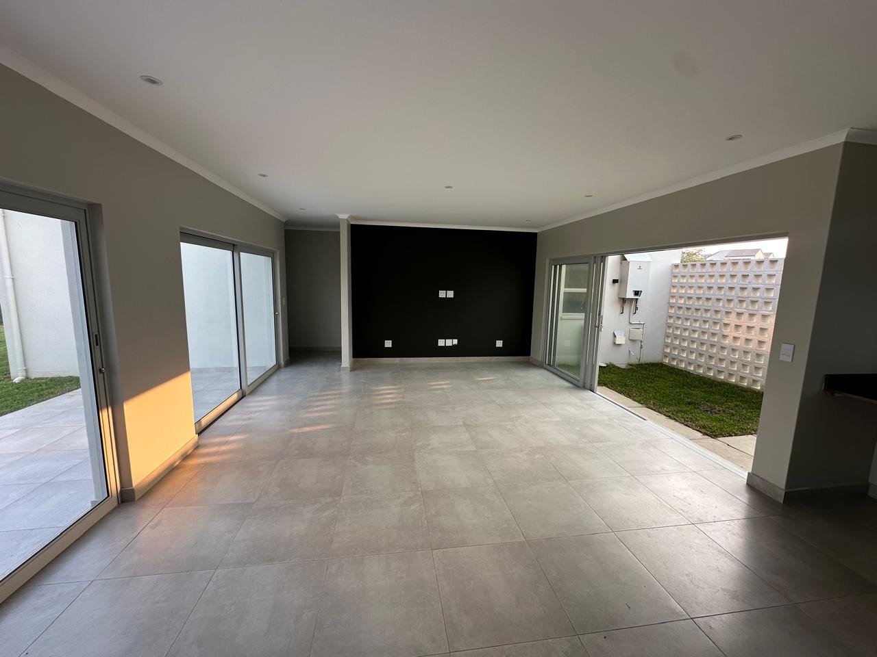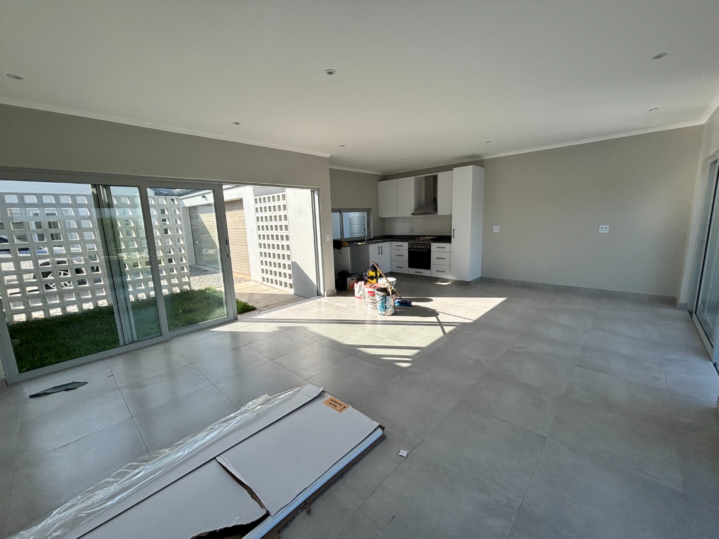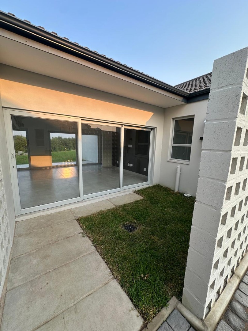 Discover this modern 3-bedroom, 2-bathroom residence available for rent within a secure estate. The open-plan living area features contemporary light grey tiled flooring and neutral walls, complemented by recessed lighting and crown molding. The newly fitted kitchen is a highlight, boasting white flat-panel cabinetry, dark grey countertops, a subway tile backsplash, and includes a built-in oven, hob, and extractor fan. Large sliding doors seamlessly connect the interior to a private patio and garden, perfect for relaxation.