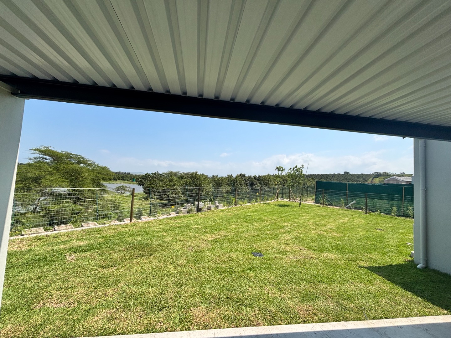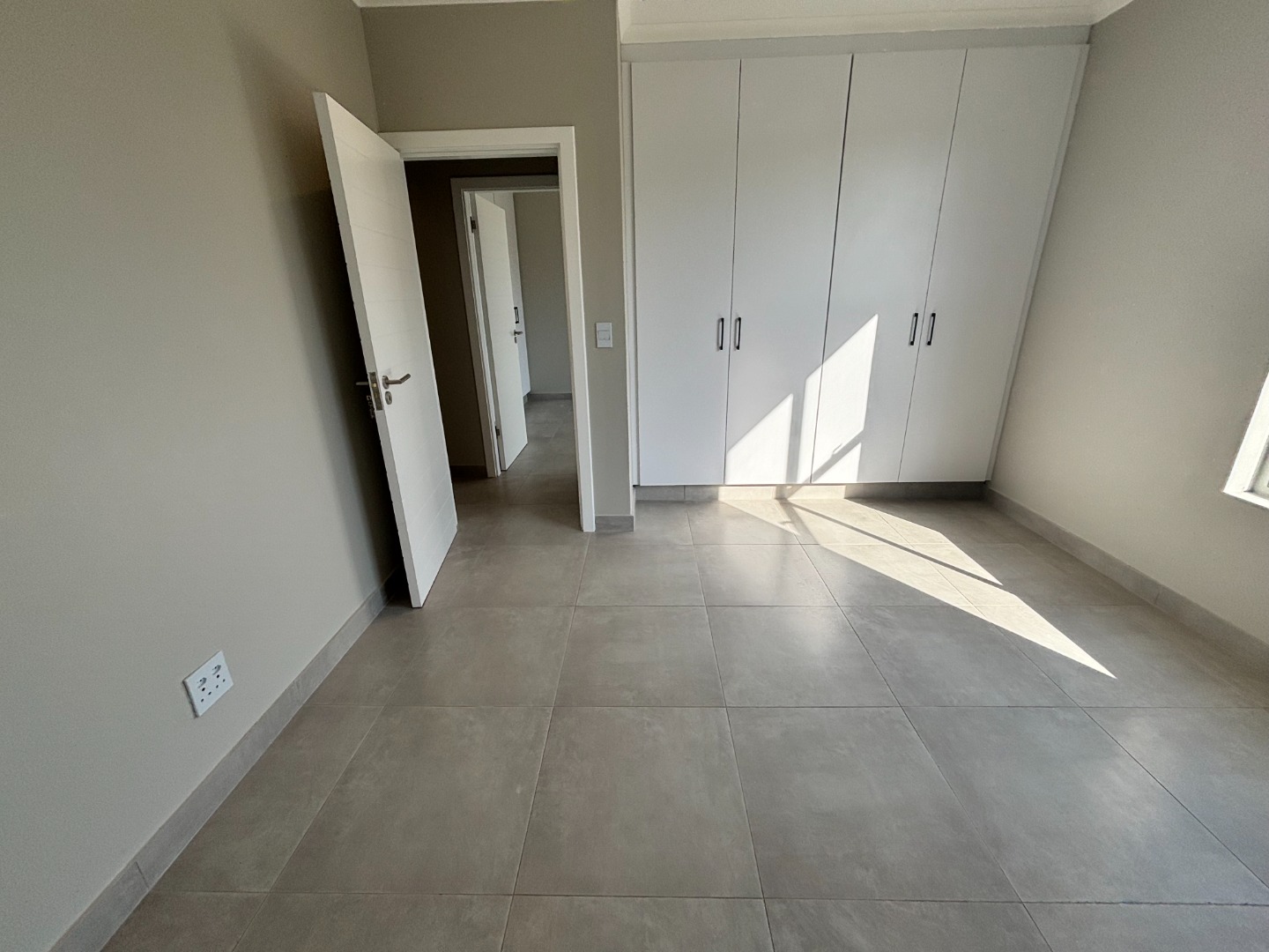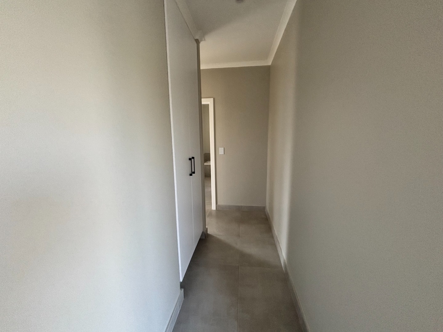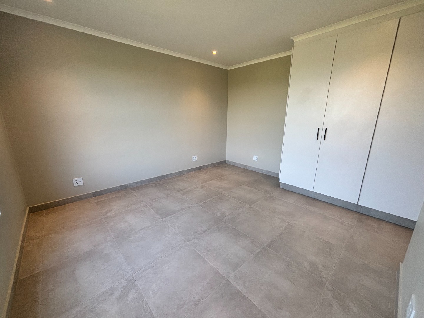 Discover this modern 3-bedroom, 2-bathroom residence available for rent within a secure estate. The open-plan living area features contemporary light grey tiled flooring and neutral walls, complemented by recessed lighting and crown molding. The newly fitted kitchen is a highlight, boasting white flat-panel cabinetry, dark grey countertops, a subway tile backsplash, and includes a built-in oven, hob, and extractor fan. Large sliding doors seamlessly connect the interior to a private patio and garden, perfect for relaxation.