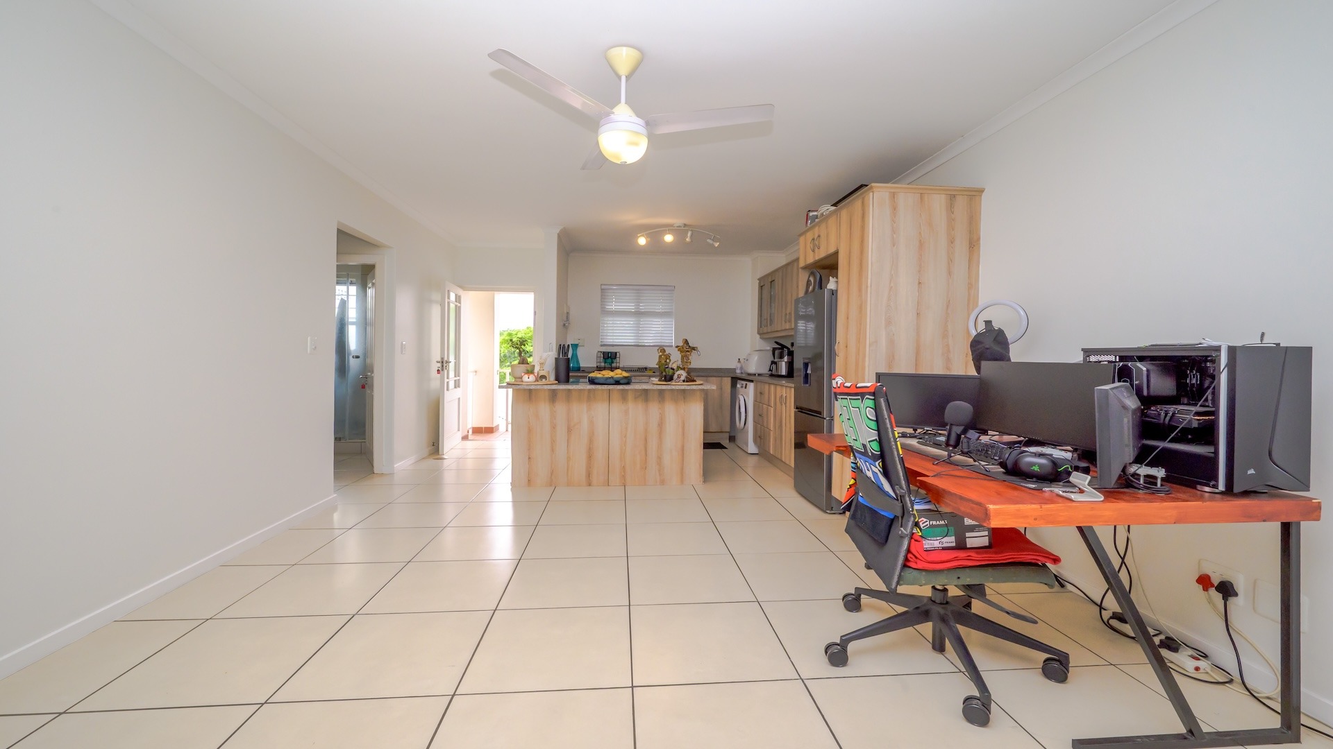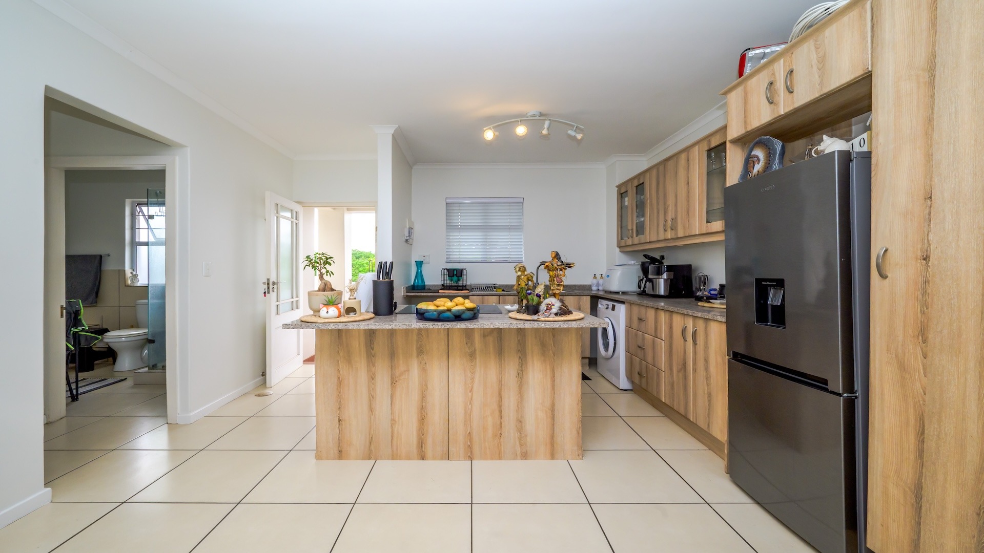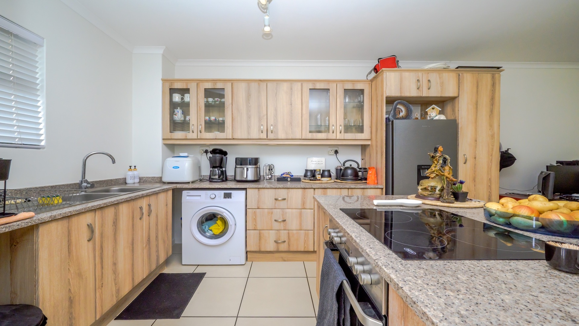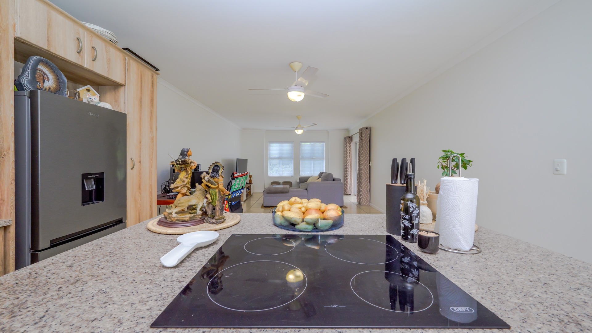 The home features a bright, open-plan living and dining area that flows seamlessly into a contemporary kitchen fitted with light wood-grain cabinetry, granite-style countertops, and a practical centre island with an integrated cooktop. Tiled flooring throughout ensures a clean, low-maintenance finish.