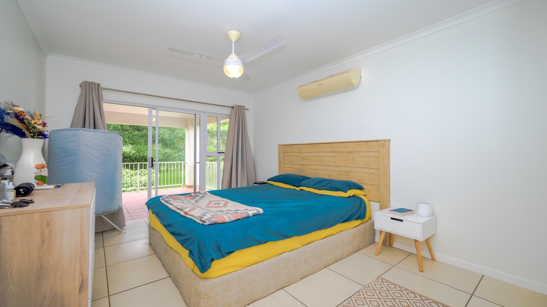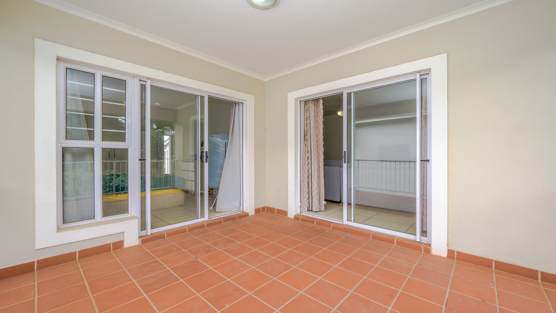 The apartment offers one well-sized bedroom and one bathroom, ideal for a single professional or couple. Large sliding doors open onto a spacious covered balcony and patio, overlooking lush communal gardens and mature trees—perfect for relaxing or entertaining in a tranquil setting.
