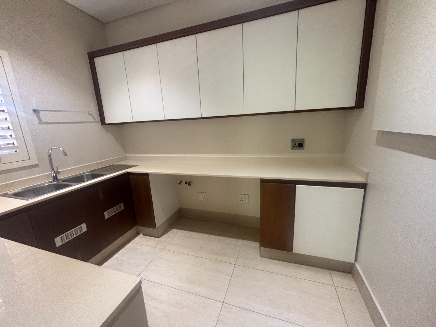 The heart of the home is a sleek, modern kitchen equipped with a central island, gas hob, and double ovens, complemented by integrated Smeg appliances and warm-toned wooden cabinetry. A separate utility area with two-tone cabinetry and a double stainless steel sink adds to the functionality.