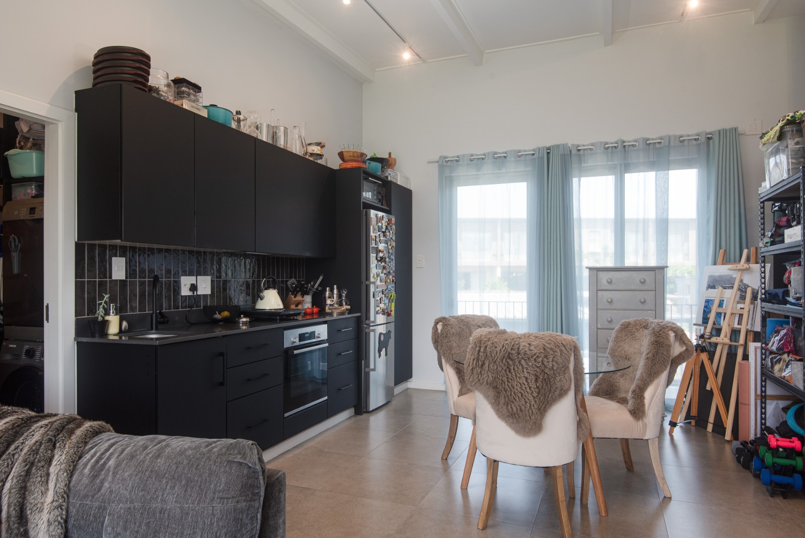 The kitchen is well-appointed and comes fitted with large appliances, including a fridge, dishwasher, and washing machine. A separate scullery/wash room provides additional space for dishes and laundry, keeping the main living area neat and uncluttered.