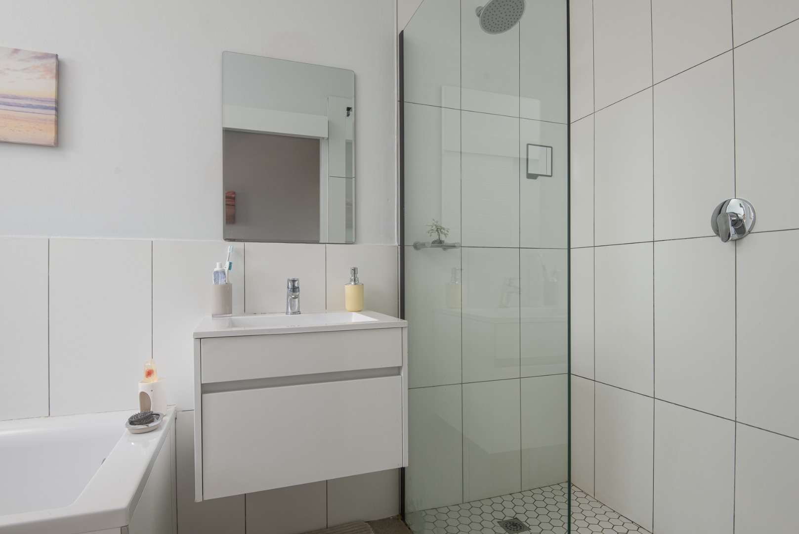 Both bedrooms are well-sized, with the main bedroom featuring an en-suite bathroom. The second bathroom conveniently services guests and the second bedroom.
